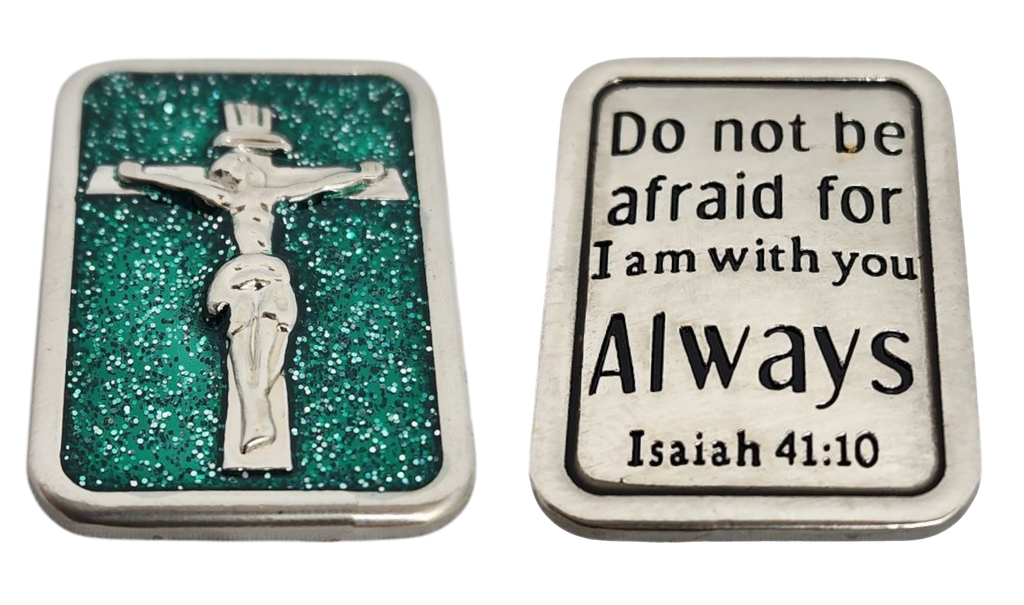 Comfort Token: Adorned with an image of Jesus on the cross, the back reads, “Do not be afraid for I am with you always.” (Isaiah 41:10), offering comfort and assurance in God’s presence.