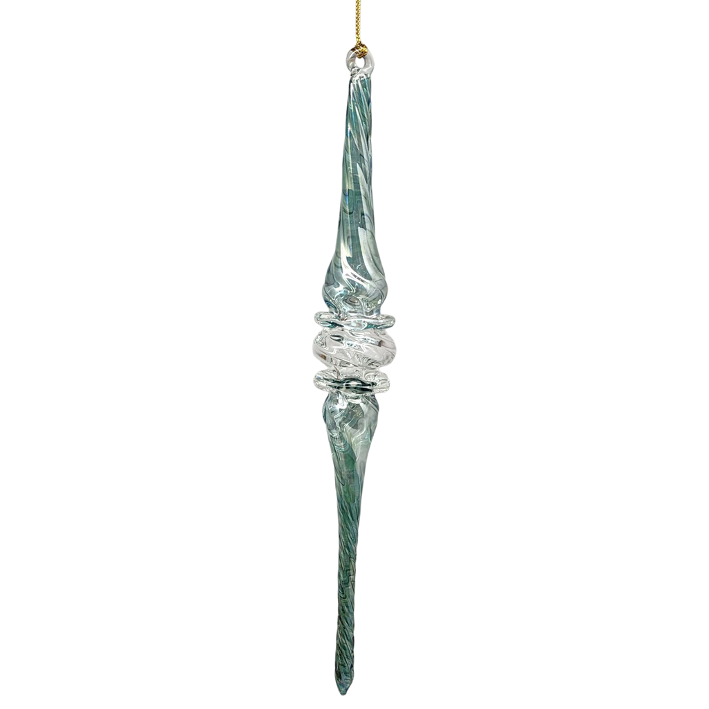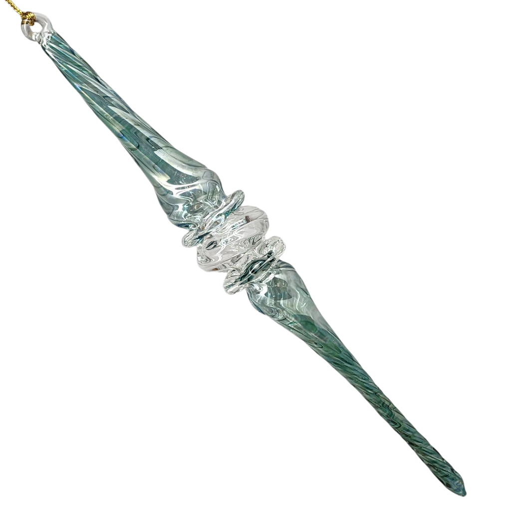 Bring a breath of coastal calm to your holiday décor with this Seafoam Spiral Icicle Ornament. Crafted from mouthblown German Pyrex glass in Egypt, its cool seafoam hue ripples through the elongated form like a sliver of frozen wave. A clear, handcrafted spiral at its center refracts twinkling tree lights, creating the illusion of an icy swirl caught in motion. Each ornament is hand-painted and oven-baked to seal in the color, ensuring it stays luminous through many seasons of festive displays.
