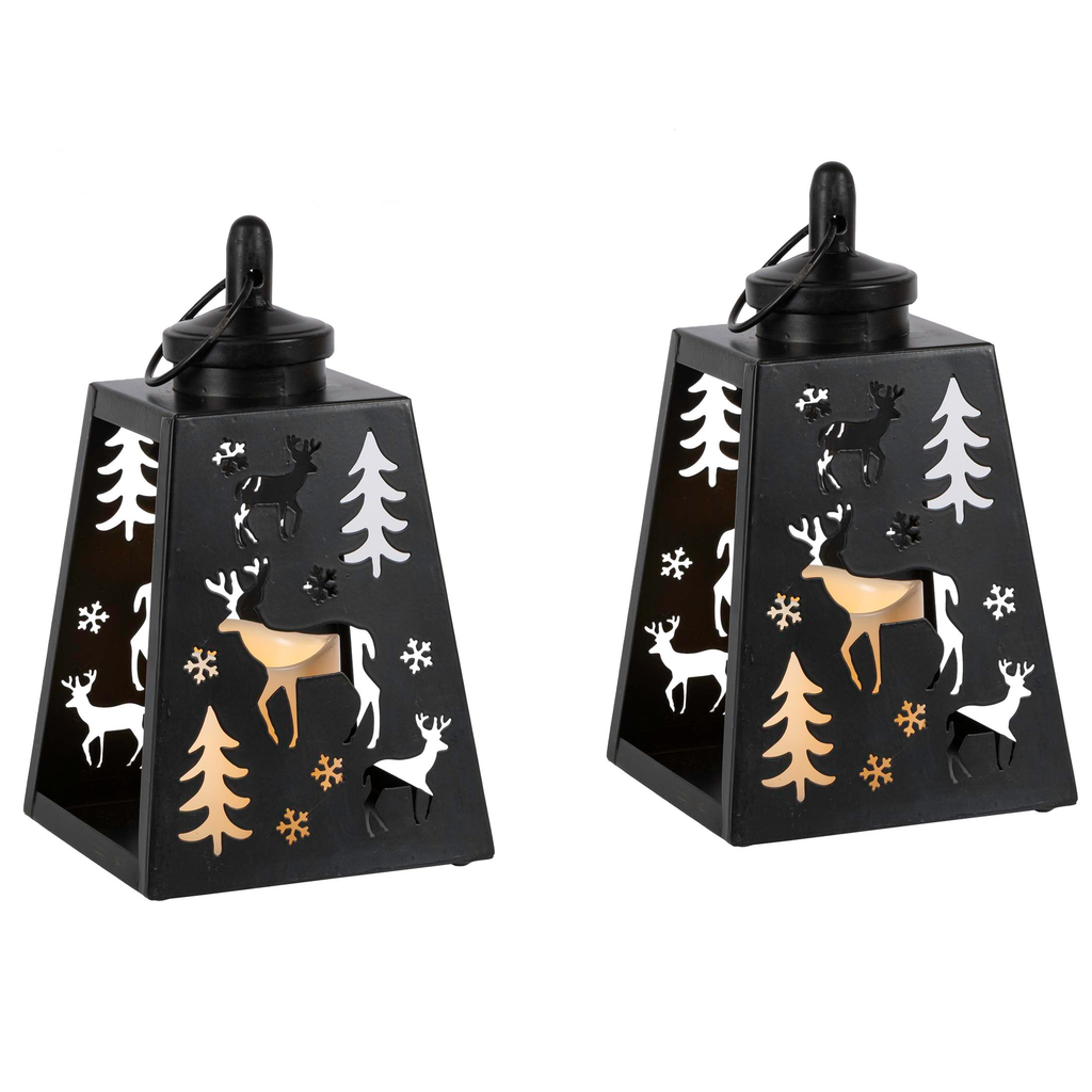 Bring the magic of the holiday season into your home with this enchanting set of two Holiday Lanterns. Standing at 8.3 inches tall, these metal lanterns are beautifully adorned with cutout designs featuring reindeers, snowflakes, and festive trees, capturing the nostalgic charm of Christmas. The deep black finish adds a warm and cozy touch, making them perfect for complementing your festive decorations.