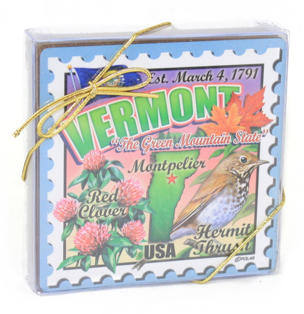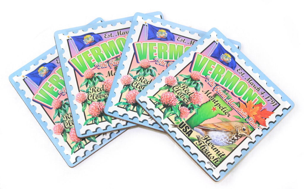 Each coaster appears as a Stamp with Vermont Icons including Maple Leaves, the Hermit Thrush, Red Clover and more.