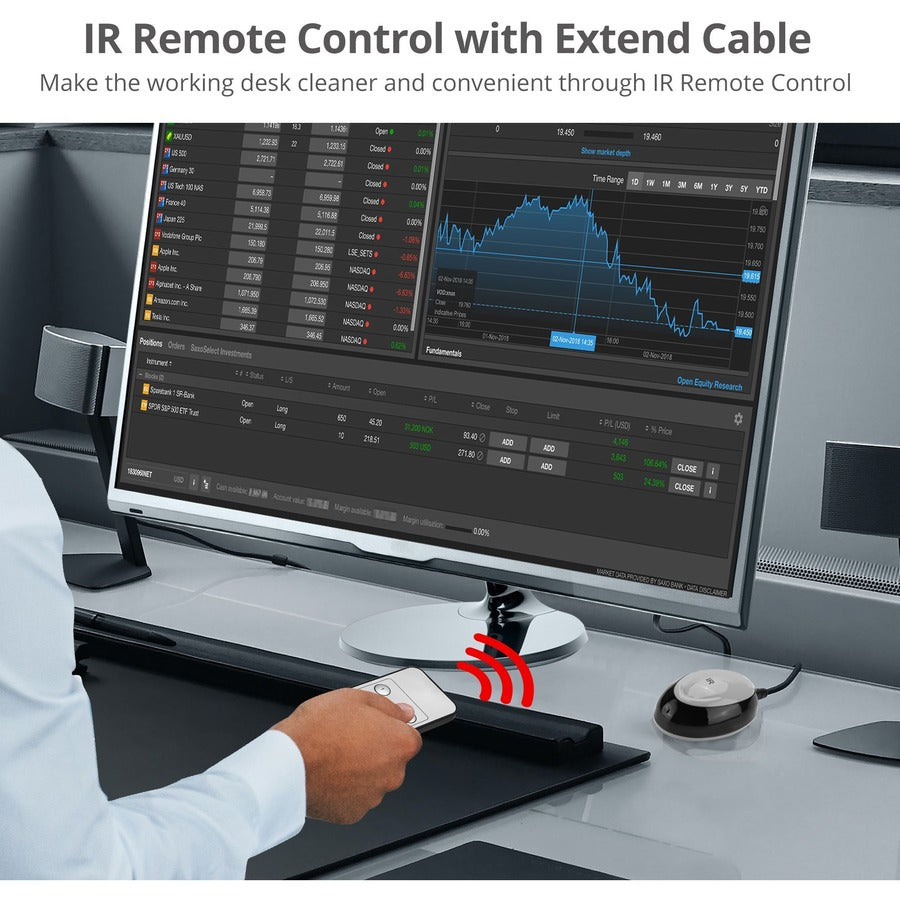 Comes with two HDMI video input ports, two USB 3.2 Gen 1 Type-B ports (Host), eight 3.5mm phone jacks to connect stereo speakers/earphone and microphone, one HDMI video output port, two USB 3.2 Gen 1 Type-A, two USB 2.0 for keyboard & mouse connection, one 3.5mm Infrared jack to extend the IR signal, one IR sensor, two switch buttons, one power button, and one DC power jack (5V/3A)