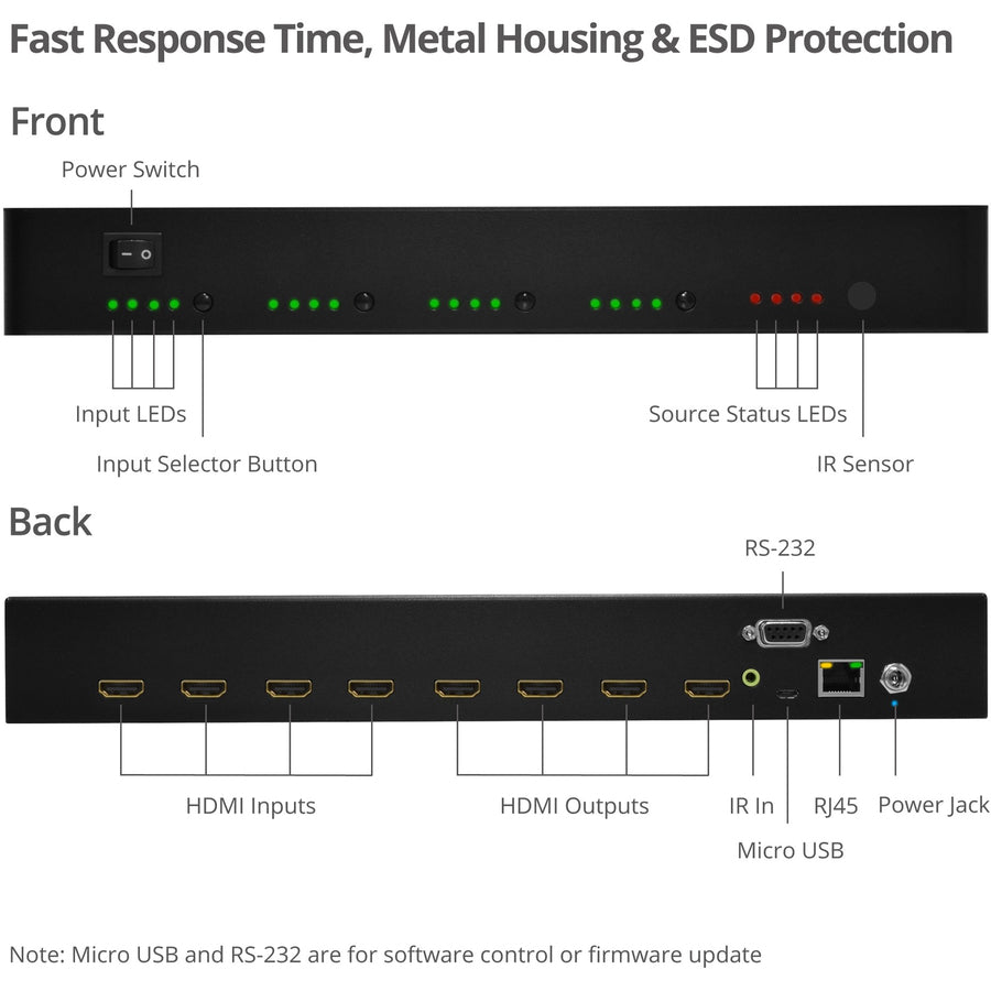 - Easily switch between HDMI source and display using push button, IR remote control, RS-232, and Ethernet control and cloud control