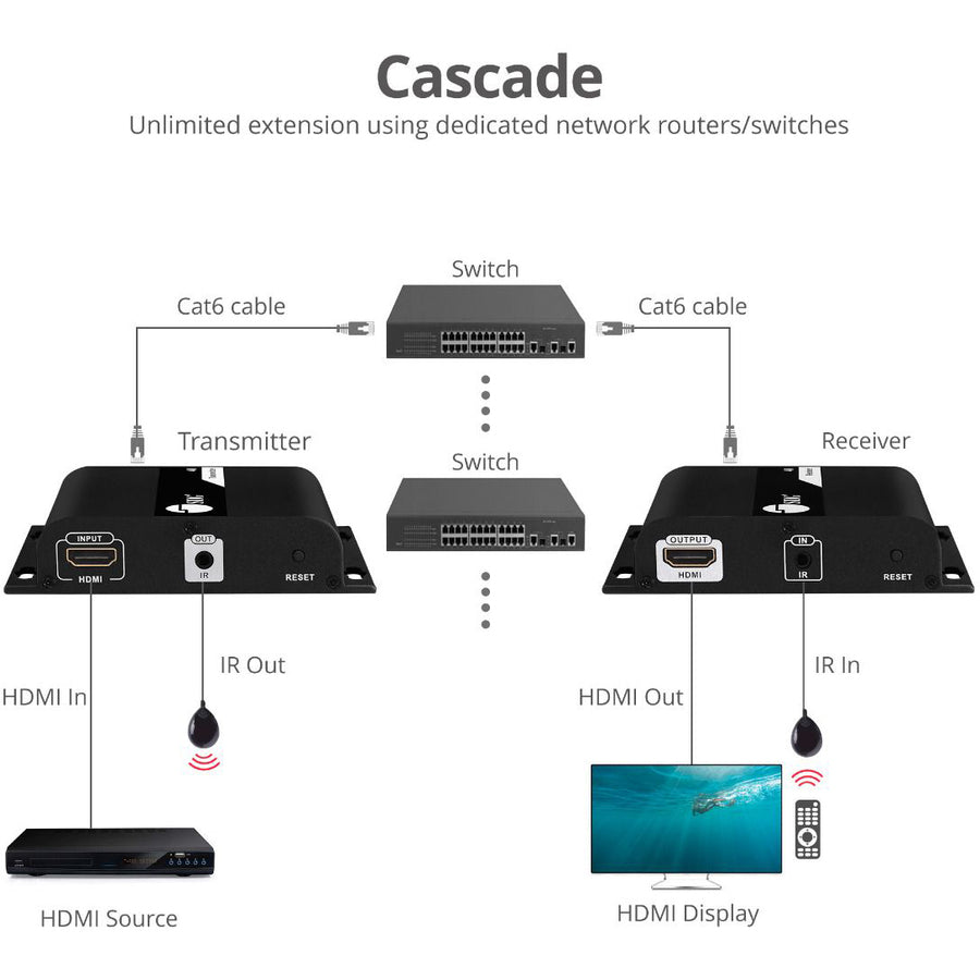 - With a single Cat6 cable, you can easily extend HDMI audio/video signals up to 394ft. Connect your HDMI source device (PC, Blu-ray player, media player) to the Transmitter, utilize existing Ethernet structure in your house/office to connect the transmitter to Receiver, then connect your HDTV from a remote location to the Receiver