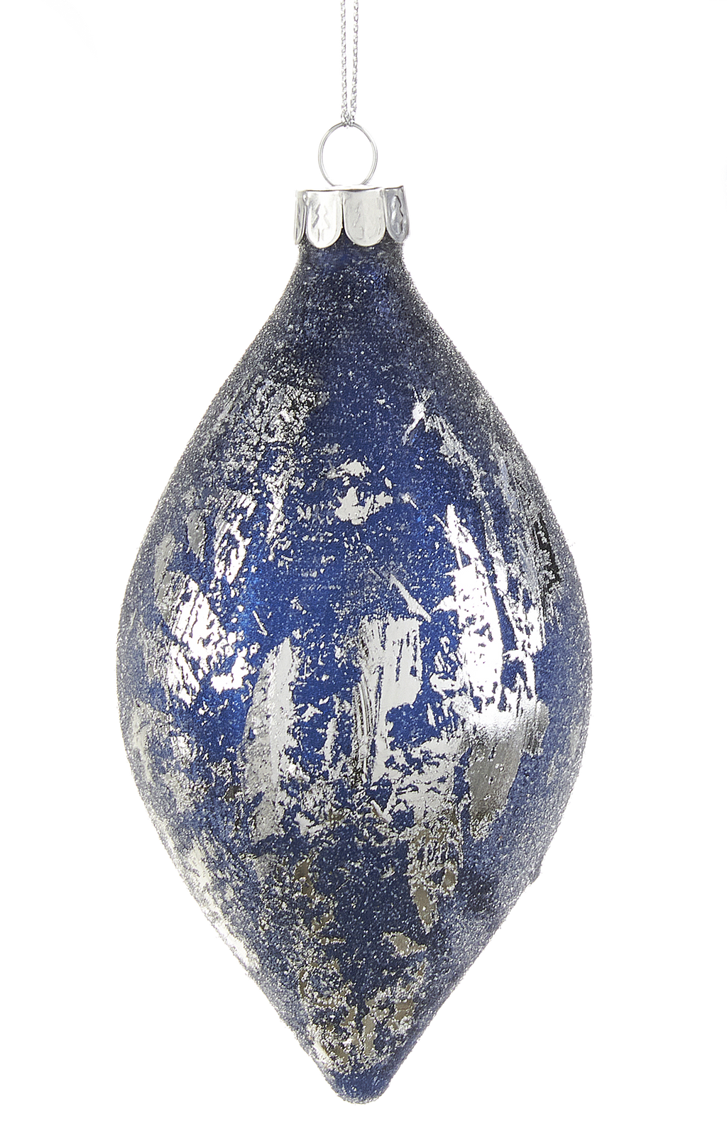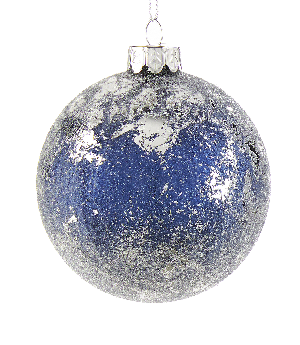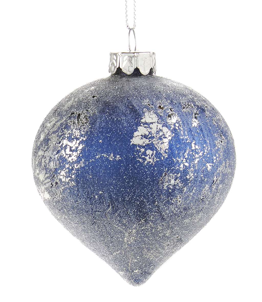 Silver glass ornament with an Indigo blue sugared coating.