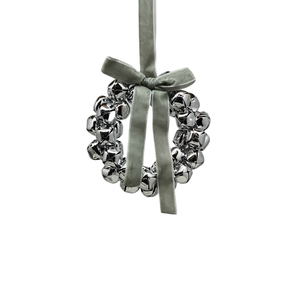 Welcome the festive spirit into your home with this charming 6-inch silver bell wreath! Adorned with shiny metallic bells, this delightful piece adds a touch of whimsy and cheer to your holiday decor. The soft green velvet ribbon beautifully complements the metallic sheen, creating an eye-catching contrast that enhances its festive charm.