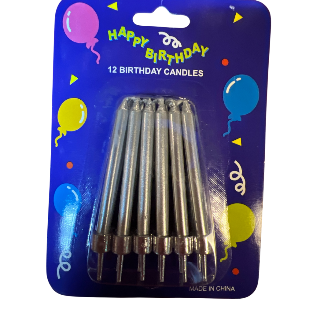 Silver Metallic Birthday Candles in Holders - Set Of 12