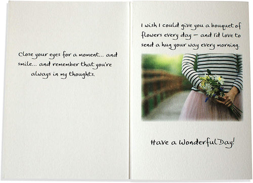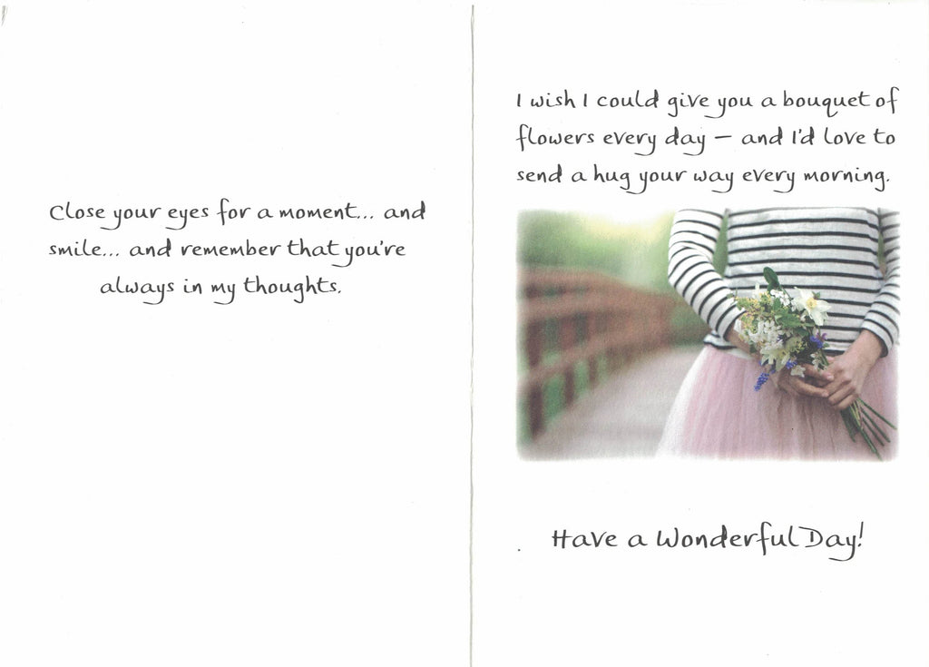 Inside message: Close your eyes for a moment and smile and remember that you’re always in my thoughts. / I wish I could give you a bouquet of flowers every day — and I’d love to send a hug your way every morning. / Have a Wonderful Day!