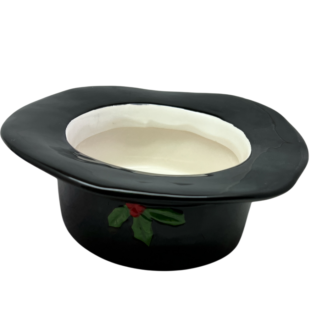 Add a whimsical touch to your holiday decor with this Snowman Hat Decorative Bowl, measuring 9.5 x 9.5 x 3 inches tall. Perfect for holding festive treats or as a charming centerpiece, this bowl features a classic black hat design with a subtle holly accent. Ideal for adding a playful and seasonal element to your home.
