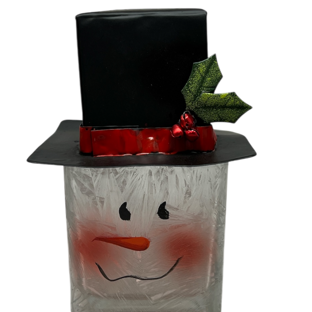 Celebrate the winter season with our charming Snowman Tealight Candle Holder! Sturdily crafted with a glass base and an adorable metal top, this delightful candle holder stands at 6 inches tall and measures 4 inches wide. The whimsical design features a cheerful snowman face complete with a removable top hat adorned with festive holly and jingling bells, adding a playful touch to your holiday décor.
