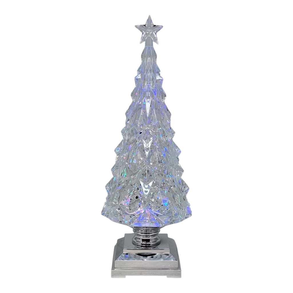 Introducing the Glistening Holiday Tree a stunning centerpiece that stands at 12.5 inches tall and spins gracefully filling the room with a mesmerizing water and light show. This enchanting tree casts a warm radiant glow that reflects off its beautifully faceted surface making any holiday gathering feel magical. Powered by 3 AA batteries this sparkling ornament will be the highlight of your seasonal decor whether displayed on a table window sill or shelf to charm guests and create a festive atmosphere.