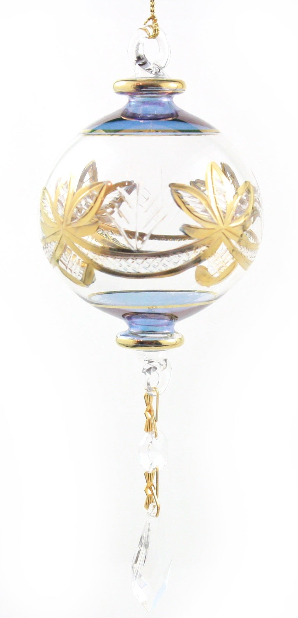 Introduce a serene touch of luxury to your holiday celebrations with the Lavender Luxe Egyptian Glass Ornament. Handmade in Egypt from durable German Pyrex Glass, this ornament features a soft lavender tint that beautifully complements its exquisite hand-engraved design. The delicate patterns are hand-painted and baked to ensure the colors remain vivid year after year. Real 24K gold accents highlight the intricate details, adding a radiant shine that captures the spirit of the season.