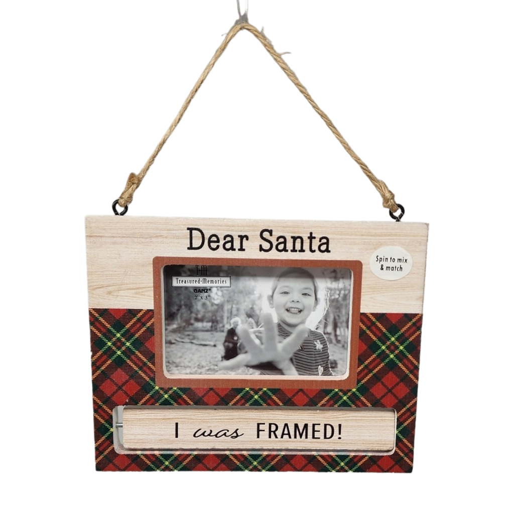 Capture holiday magic with our delightful Spinning Frame Ornament, decorated with the whimsical "Dear Santa" theme! This charming ornament combines nostalgia with interactivity, allowing you to spin it to reveal different playful messages, including "I've been good-ish" and "I was FRAMED!" Measuring approximately 3.5 inches wide by 4.5 inches high, it also holds a treasured photo sized at 2 inches by 3 inches, perfect for displaying your favorite festive memories.
