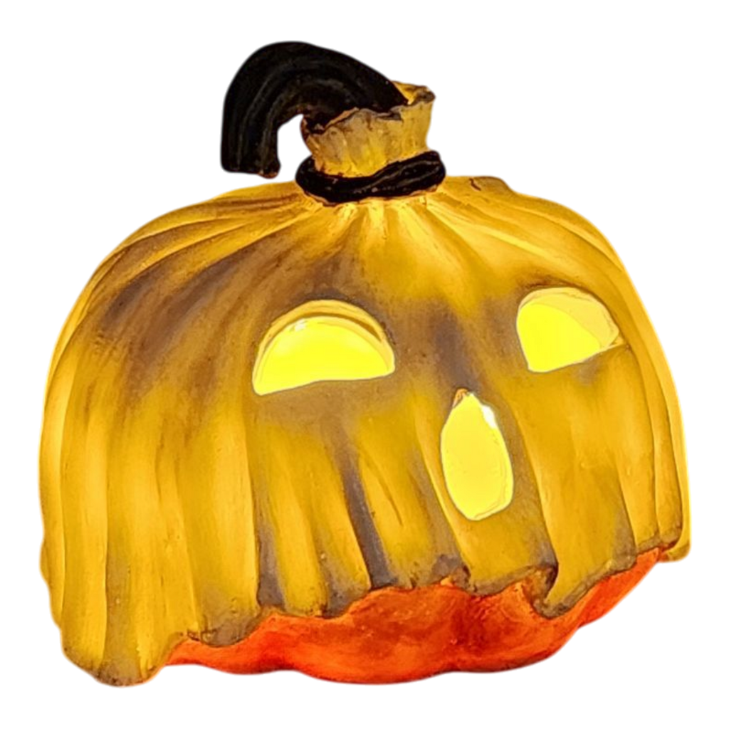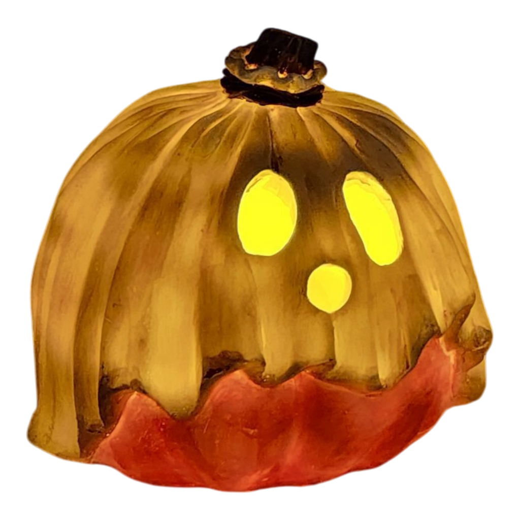 Phantom Phil - This 5.5-inch pumpkin has mysterious yet friendly features with a delightful grin. His soft glow and spectral drapery bring a hint of enchantment, making him a wonderful companion for nighttime Halloween festivities.