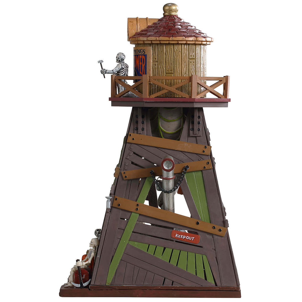 Dare to venture into the chilling depths of Spooky Town with the spine-tingling Spooky Springs Water Tower! This mesmerizing piece towers ominously above its surroundings, featuring eerie skeletons haunting its frame and casting an unsettling presence over the forsaken landscape. Each skeleton seems to guard the haunting pump room, their sinister eyes glimmering with mischievous intent. Surrounded by carved pumpkins with wickedly delightful grins, this fantastic display piece is sure to ignite both intrigue and trepidation as it brings a touch of Halloween spirit to your festive decor.