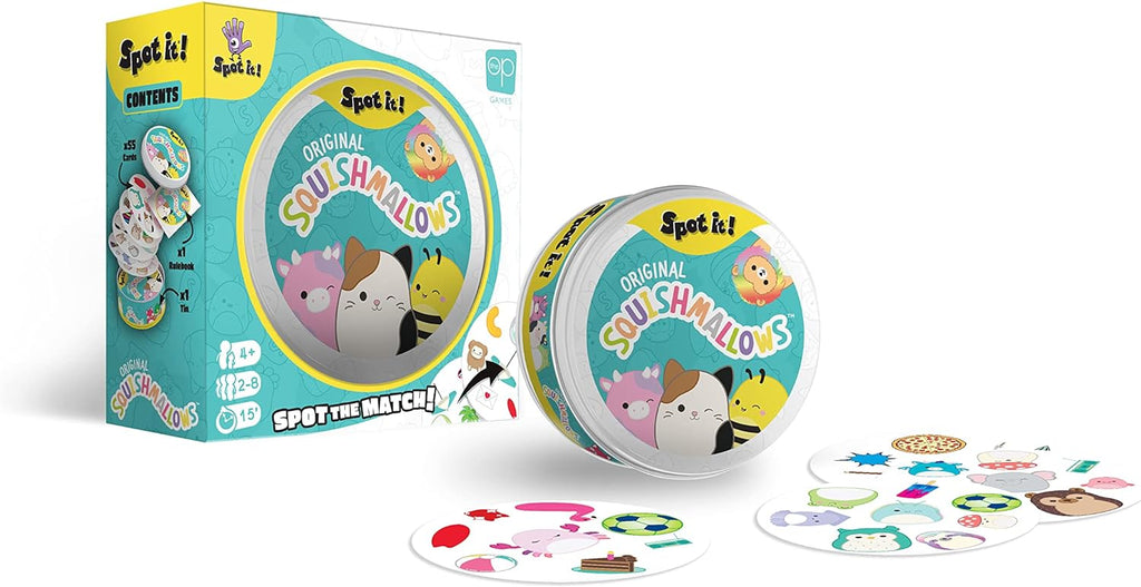 - Includes: 55 Spot It! Squishmallows themed circular cards, tin carrying case, rules