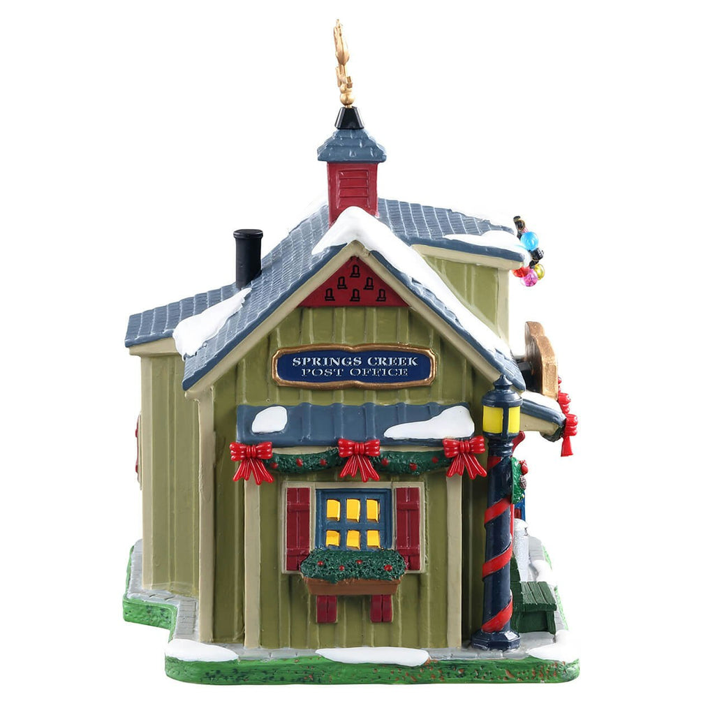 The Springs Creek Post Office is busy getting ready for the holiday season. This small office is decked out with Christmas lights and garlands. They've even decorated the lamp post. There's an outside area with PO boxes, a stamp vending machine, and a window for purchasing postage. There's even a dedicated mailbox for mailing letters to Santa. On the side of the building, there's a parcel pick-up window, a scale, and a back-door entrance.