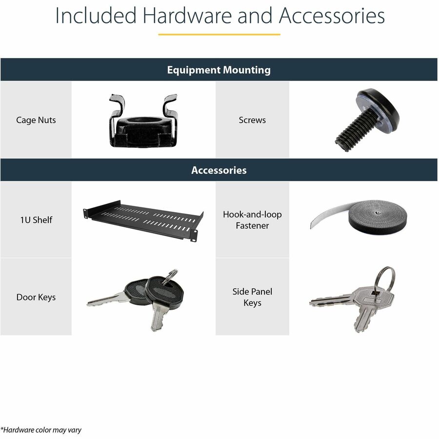 The 12U network cabinet features a removable and reversible front door and removable side panels, each with quick-release mechanisms, so you can easily access your equipment. Plus, each door and panel on this rack features an independent lock, ensuring your equipment is secure.
