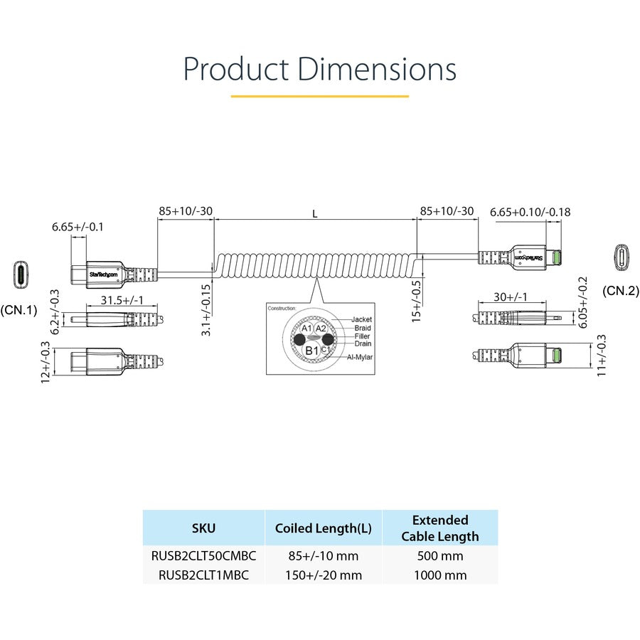 1m/3ft USB C to Lightning Cable, MFi Certified, Coiled CableThis coiled Lightning to USB C cable can withstand the daily demands of charging and syncing your mobile devices. It contracts to 1.2ft (38cm) making it compact and convenient to store.Built for Daily UseThe durable Lightning charging cable has aramid fiber reinforcement that shelters it from the stress of frequent bends. This also lets the cable flex without over-stretching or damaging the core of the cable.Flexible Strain ReliefThe Lightning to USB-C cable is constructed to prevent the connector from separating from the jacket. The extra-long strain relief molding is tested to withstand over 5,000+ bend cycles at a 180° angle.Superior ConnectionThe durable cable supports all USB 2.0 specifications providing a dependable connection for all your Lightning devices. It is also Apple MFi certified which is guaranteed for fast and reliable charge and sync from USB-C charging ports.RUSB2CLT1MBC is backed by a StarTech.com® 2-year warranty and free lifetime technical support.The StarTech.com Advantage