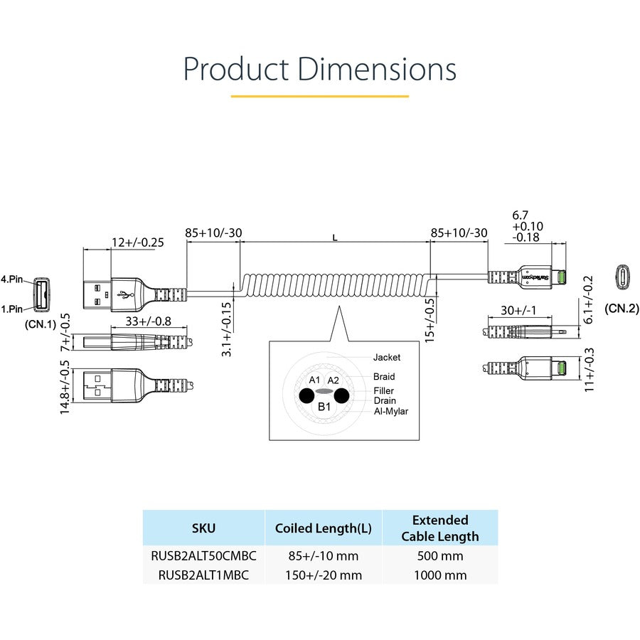1m (3ft) USB to Lightning Cable, MFi Certified, Coiled CableThis coiled Lightning to USB A cable can withstand the daily demands of charging and syncing your mobile devices. It contracts to 1.2ft (38cm) making it compact and convenient to store.Built for Daily UseThe durable Lightning charging cable has aramid fiber reinforcement that shelters it from the stress of frequent bends. This also lets the cable flex without over-stretching or damaging the core of the cable.Flexible Strain ReliefThe Lightning to USB A cable is constructed to prevent the connector from separating from the jacket. The extra-long strain relief molding is tested to withstand over 5,000+ bend cycles at a 180° angle.Superior ConnectionThe durable cable supports all USB 2.0 specifications providing a dependable connection for all your Lightning devices. It is also Apple MFi certified which is guaranteed for fast and reliable charge and sync from USB-A charging ports.RUSB2ALT1MBC is backed by a StarTech.com® 2-year warranty and free lifetime technical support.The StarTech.com Advantage