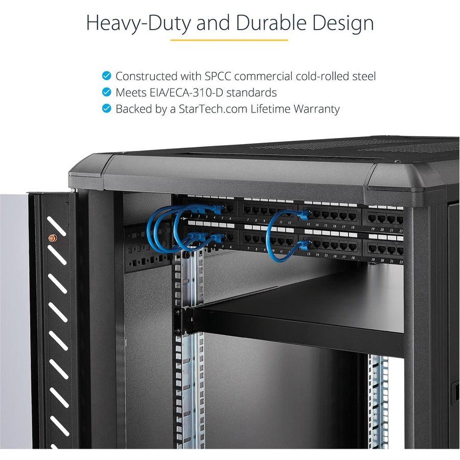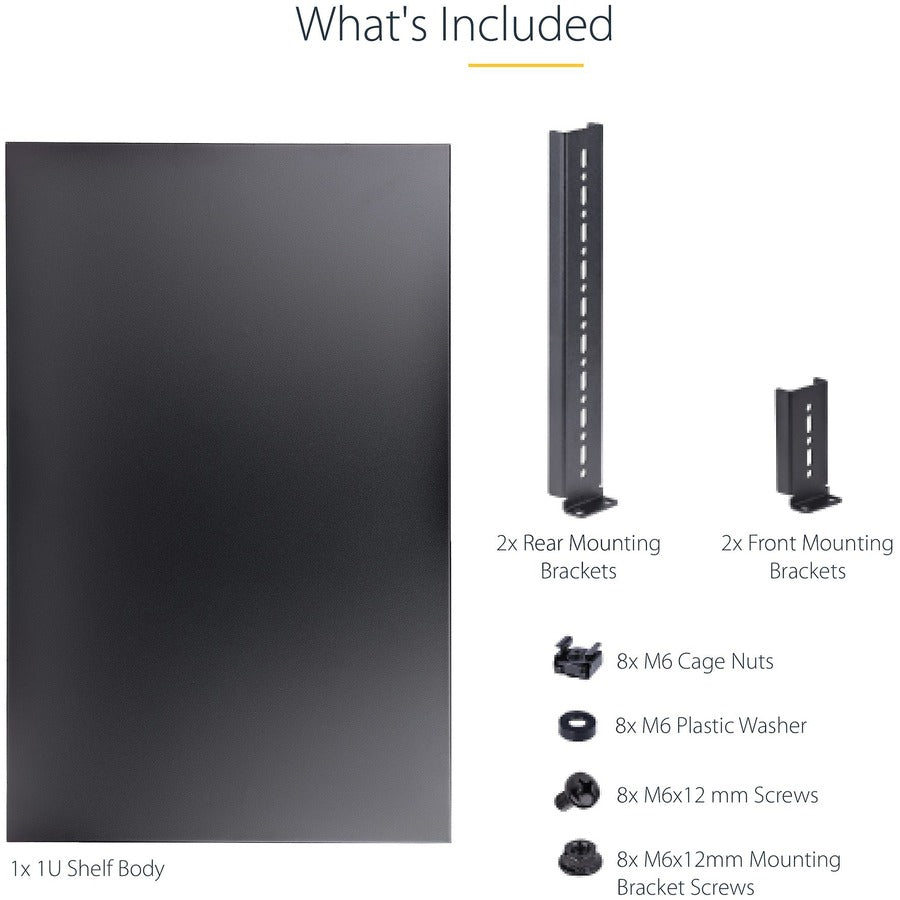 The StarTech.com Advantage - Heavy duty server rack shelf provides the ability to hold up to 80kg (175lbs) of equipment - Adjustable mounting depth brackets make it simple to add a storage shelf to a wide variety of racks or cabinets - Durable steel construction holds up to even the harshest industrial environments