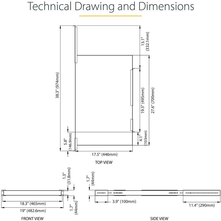 StarTech.com 1U Adjustable Mounting Depth Rack Mount Shelf - Heavy Duty Fixed Rack Shelf - 175lbs / 80kg. Type: Adjustable shelf, Product colour: Black, Housing material: Steel. Width: 450 mm, Depth: 700 mm, Height: 44 mm. Package width: 534 mm, Package depth: 770 mm, Package height: 90 mm