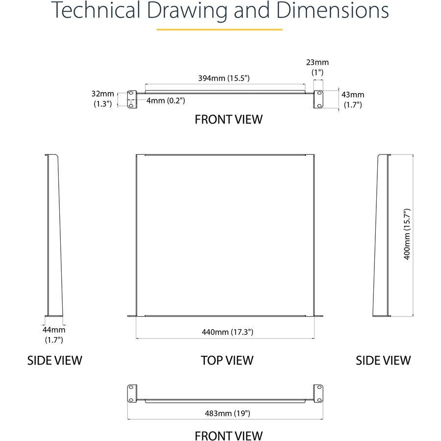 Cantilever Rack Shelf | EIA/ECA-310 Compliant | Lifetime WarrantyEnsure your equipment is secureThe durable rack mount tray can hold up to 20 kg (44 lbs.) of equipment and is constructed using SPCC commercial-grade cold-rolled steel.Make the most of your available spaceThe 1U cantilever shelf lets you optimize your working space by giving you the ability to mount equipment to your 19-inch rack instead of taking up desk or floor space. It’s perfect for your SOHO (small office, home office) environment, server room, data center or any other location with limited space available.Customize your setupYou can install the 1U network cabinet shelf in your rack at any height, giving you a stable surface for placing equipment that's un-mountable such as a computer, or for storing your tools.The Choice of IT Pros Since 1985StarTech.com conducts thorough compatibility and performance testing on all our products to ensure we are meeting or exceeding industry standards and providing high-quality products to IT Professionals. Our local StarTech.com Technical Advisors have broad product expertise and work directly with our StarTech.com Engineers to provide support for our customers both pre and post-sales.The CABSHELF116 is backed by a StarTech.com lifetime warranty and free lifetime technical support.The StarTech.com Advantage