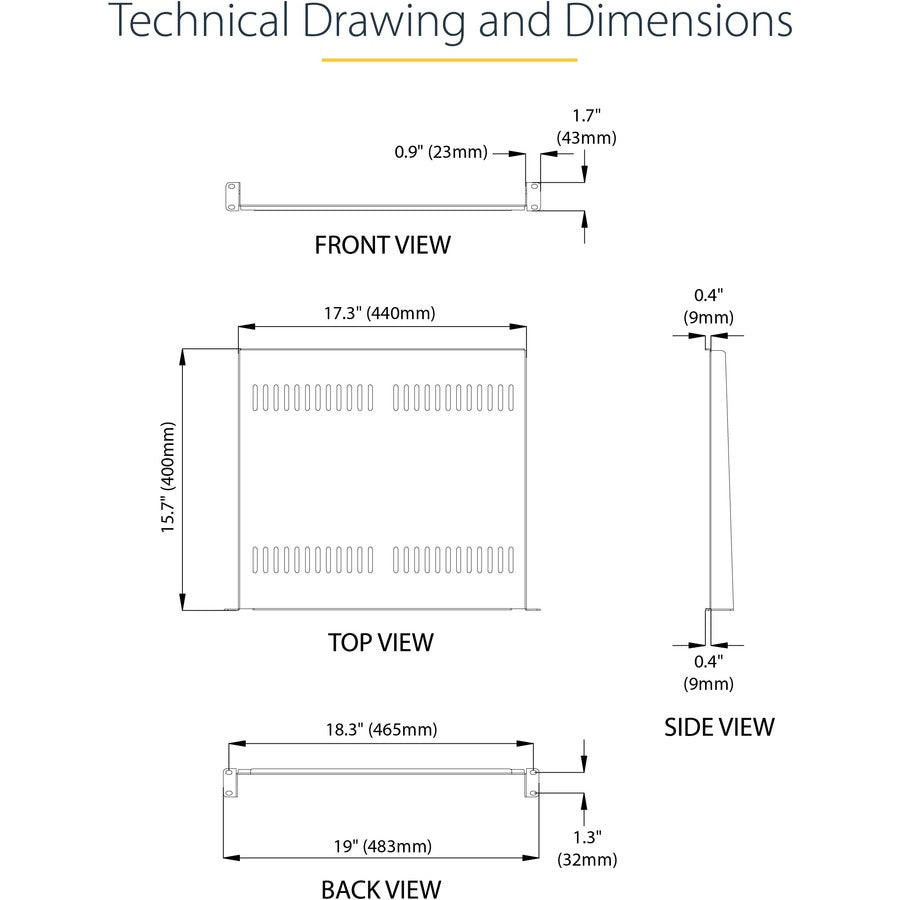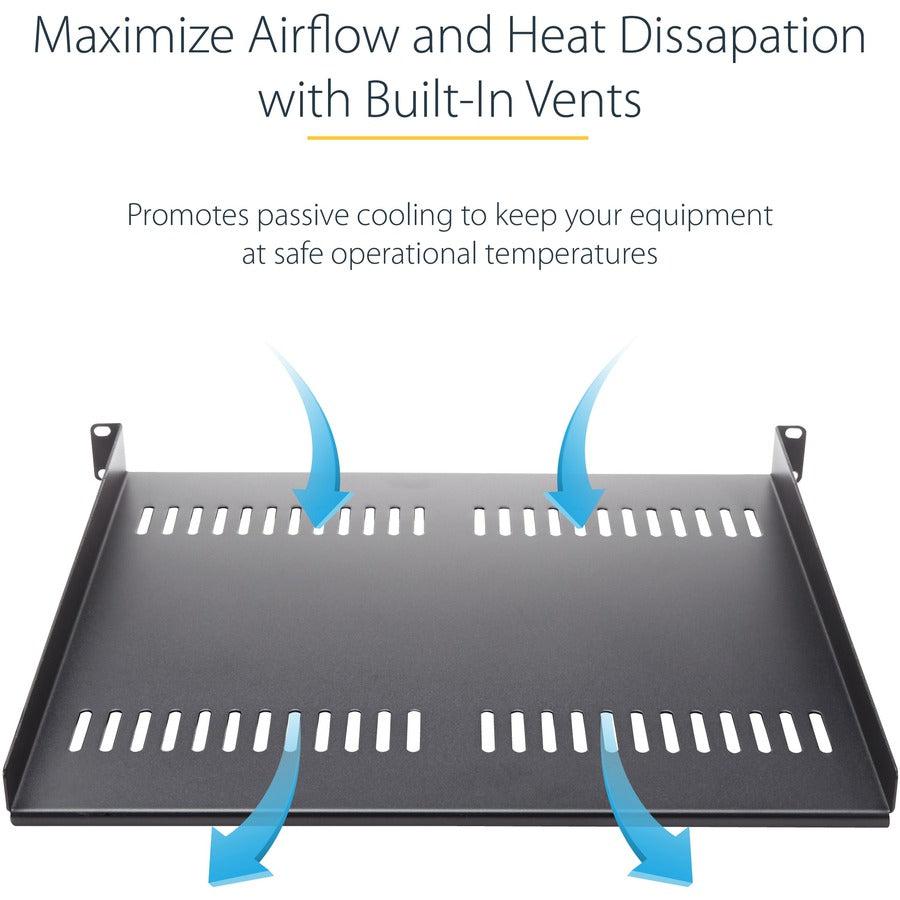 Add a sturdy, 1U server rack shelf into almost any rack or cabinetThis 1U rack shelf lets you add 16 in. of flat storage space to any EIA-310 compliant server rack or cabinet. The shelf is vented to improve air flow and help lower temperatures in your rack.Ensure your equipment is secureThe durable fixed-rack shelf can hold up to 20 kg (44 lbs.) of equipment and is constructed using SPCC commercial-grade cold-rolled steel.Make the most of your available spaceThe 1U cantilever shelf lets you optimize your working space by giving you the ability to mount equipment to your rack instead of taking up desk or floor space. It’s perfect for your SOHO (small office, home office) environment, server room or any other location with limited space available.Customize your setupYou can install the 1U vented rack shelf in your rack at any height, giving you a stable surface for placing equipment that's un-mountable or storing your tools.The CABSHELF116V is backed by a StarTech.com lifetime warranty and free lifetime technical support.The StarTech.com Advantage