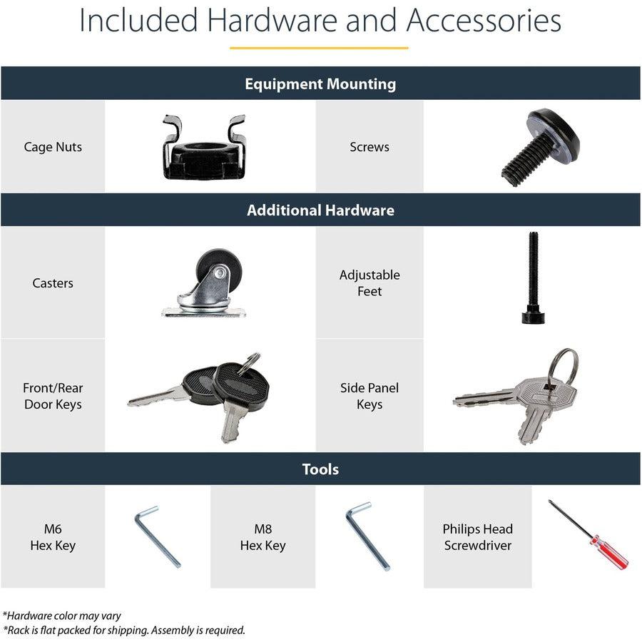 StarTech.com 32U 19" Server Rack Cabinet - Adjustable Depth 6-32" - Flat Pack - Lockable 4-Post Network/Data/AV Equipment Rack Enclosure with Glass Door & Casters - 1763lb/800kg Capacity. Type: Freestanding rack, Rack capacity: 32U, Maximum weight capacity: 800 kg, Key lock, Castor wheels. Weight: 101 kg. Product colour: Black