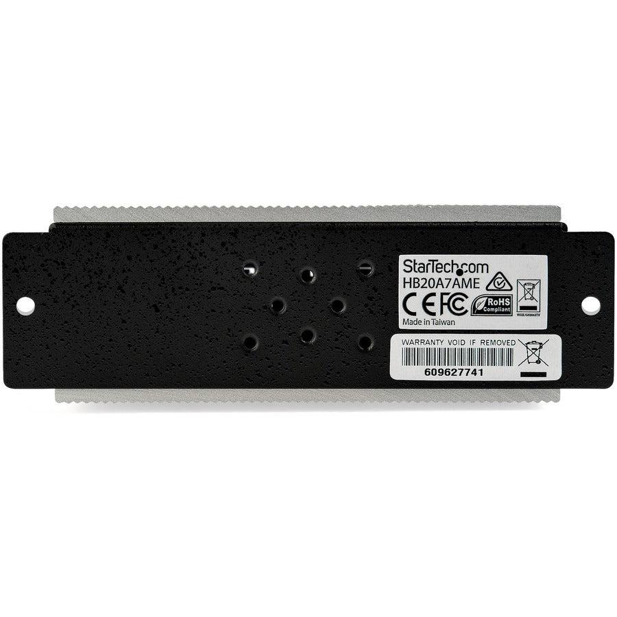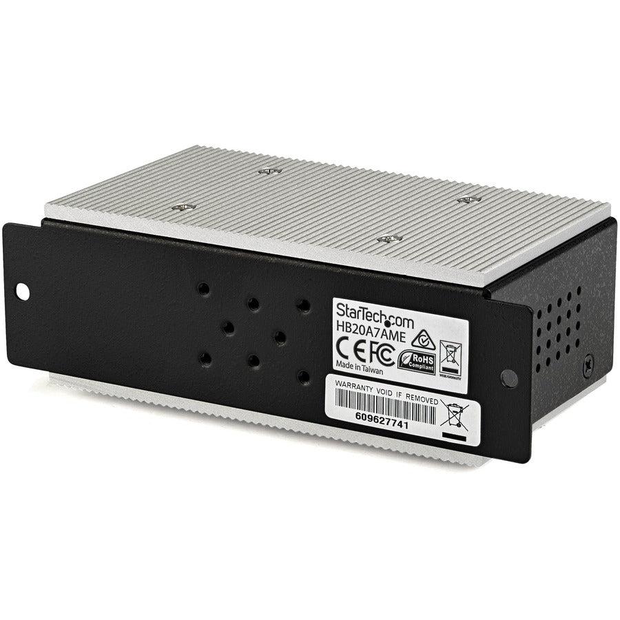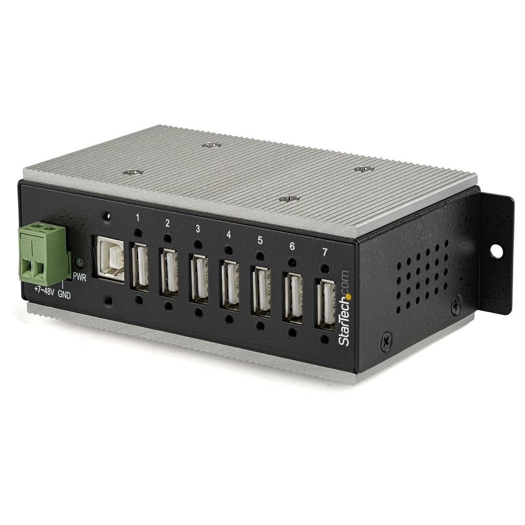 Extended Temperature| 15kV Air | 8kV Contact | Metal | Mountable | DIN Rail | 480 MbpsThis TAA compliant 7-port industrial USB 2.0 hub gives you the scalability you need in harsh industrial environments, product and repair labs, conference rooms or office workstations. With its rugged industrial grade metal housing, it is designed to meet the advanced requirements of connecting a high number of devices in factories and office environments.Perfect for Harsh EnvironmentsThis industrial USB hub delivers reliable performance with a metal, heavy-duty housing. It supports wide-range 7-48V DC terminal block input, giving you the flexibility to power the hub as required, based on your own power input capabilities.Perfect for more extreme environments, the rugged hub also supports a wide operating temperature range (-40°C to 85°C) and offers ESD protection to each USB port, which can help prevent damage to your connected devices.Connect More USB DevicesDesigned for a high volume of connections, this robust USB 2.0 hub offers seven connection ports, for connecting more USB devices and peripherals.Locate the Hub Where You Need It MostWith versatile installation options, you can install the hub where it’s best suited for your environment. With built-in mounting brackets, included DIN mount rails, and an included 2-meter USB host cable, you can securely mount the USB 2.0 hub to most surfaces such as a wall, under a desk or rack.StarTech.com offers an external power adapter, ITB20D3250, sold separately. The universal DC power adapter can be used as an alternative, back up or replacement power supply for StarTech.com’s line of industrial USB hubs.Works with Older USB DevicesThe rugged USB hub supports the full 480 Mbps bandwidth of USB 2.0 and is backward compatible with previous USB devices.The HB20A7AME is backed by a StarTech.com 2-year warranty and free lifetime technical support.The StarTech.com Advantage