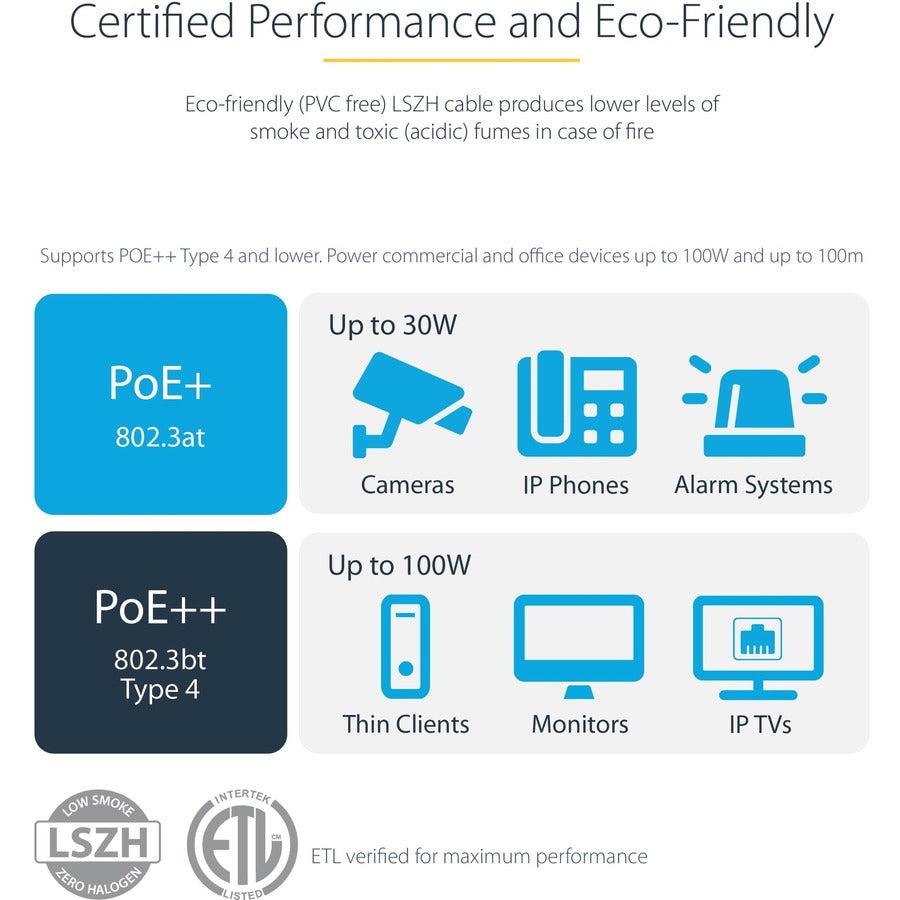CAT6 Ethernet Cable | LSZH | Snagless | 100W PoE | Lifetime WarrantyStarTech.com AdvantageStarTech.com products are designed for IT Professionals to meet their technical standards. Product quality, compatibility and reliability are ensured by our in-house and third-party labs and certifications by leading technology companies.StarTech.com's line of CAT6 cables use 100% copper and gold-plated pins. All of our Category 6 cable products undergo rigorous physical and electrical tests, including the repetitive bend cycle test. Each cable is individually tested (Fluke® patch cord test) to measure worst case NEXT and RL. Beyond our own testing, we work with leading external test labs such as ETL, to obtain product performance and safety certifications.Backed by a risk-free StarTech.com lifetime warranty and 24 hour, five day-a-week, support from qualified Technical Advisors, our brand is trusted throughout the IT ecosystem and used by over 80% of Fortune 500 companies.Product OverviewLow Smoke Zero Halogen (LSZH) Category 6 Snagless Network Patch Cable supports error-free Multi Gigabit connections: 1Gbps, 2.5Gbps, 5Gbps and 10Gbps (up to 160ft/55m). This PVC free high-performance cable offers reliable connectivity to all networking devices, such as Network Interface Cards (NIC), servers, routers, network attached storage (NAS), VoIP phones, PoE devices, etc.This Eco-friendly LSZH CAT6 cable produces lower levels of toxic corrosive fumes and white smoke in the event of a fire, which offers higher visibility, allowing for a safer and faster evacuation.StarTech.com offers the widest selection of lengths and colors, to keep your business network and workstations connected and organized.High Performance CAT6 Ethernet Cable- Reliably Connect Your Ethernet Devices- Error-free Multi Gigabit support - 1Gbps, 2.5Gbps, 5Gbps and 10Gbps (up to 55m), 10GBase-T- 650MHz support for increased bandwidth- 100% Copper Cable, Ideal for Powering Your Devices Over EthernetMade with 100% bare copper wire, StarTech.com cables are fully compliant with, unlike other cables that use copper clad aluminum (CCA) wire.- Tested up to 100W continuous power throughput.- Complies with IEEE 802.3bt Type 4 standard.- Excellent heat dissipation over prolonged use.Supports high power PoE for Laptops, IP TVs, Security Cameras, VoIP phones, NAS devices, etc.- Quality Construction- 50-micron gold platted connectors- Snagless boot- 40 mm (1.57") bend radius for strong molded strain relief and improved flexibilityThe Snagless design protects the RJ45 clip and ensures the cables are easily pulled through constrained spaces such as conduits or raceways and prevents the cable from getting caught/damaged during installation.Engineered for Professional Applications- Detailed Spec Drawings AvailableStarTech.com makes it easy for you to integrate the CAT6 cable into your network by providing detailed technical specifications and engineering drawings.- Hassle-free Installation with Reliable Performance and Flexibility- 6.0 mm (0.23") OD, Flexible PVC-Free jacket with 100 mm (3.93") bend radius- Flexible HD-PE insulation for reduced Intra-pair Crosstalk- Spline separator for reduced Inter-pair Crosstalk and improved heat dissipation for 100W PoE- 24AWG (0.25mm2), 100% copper, stranded wire twisted pairs- U/UTP cable construction- Electrical Characteristics- ETL Verified for maximum performance- Cable Impedance: 100 ohms ± 15% at 250 MHz- Max. DC Resistance: 14 ohms per 1000 ft (305 m)- Pair to GND Capacitance: 330 pF per 328 ft (100 m)- Mutual Capacitance: 5.6 nF per 1000 ft (305 m)- Propagation Delay Skew: 45 ns per 328 ft (100 m)Lab Tested and Third Party Certified for Product Performance and Safety- ETL Verified- 3P Verified to ANSI/TIA-568-2.D Category 6- Fluke® Tested CAT6 Patch CordThe StarTech.com Advantage