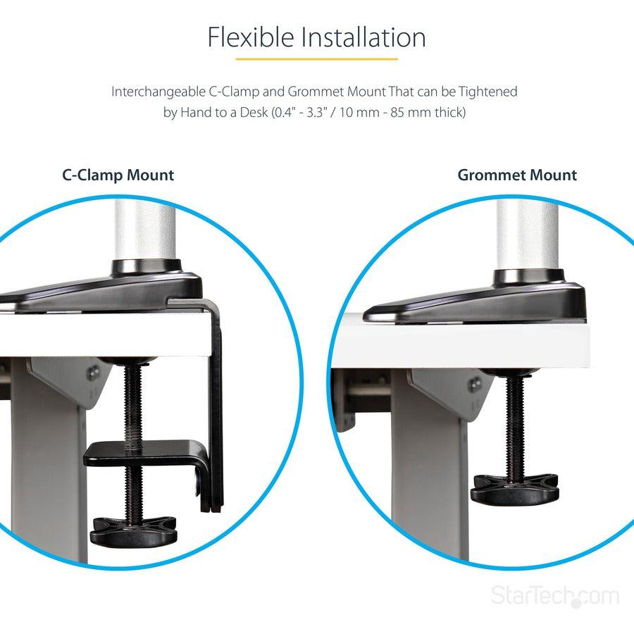 Monitor Arm with Laptop Tray | Up to 34" monitors & 8kg in weight | C-Clamp MountingThis Desktop Mount Laptop Arm enables you to raise your laptop off your desk and position it to increase ergonomics and productivity. Alternatively, you can mount a monitor up to 34" (16:9 or 21:9). The laptop/monitor arm supports up to 17.7lb / 8kg in weight, and it features cable management, one-touch/spring-assisted height adjustments along the 12.2" pole while extending up to a total height of 22" from the surface of the desk.Laptop and Monitor SupportThe laptop tray offers an area of 12.6"x9.5" to support your laptop up to 17.7lb/8kg, and it is fully adjustable to your viewing angle and height. When not using this arm as a laptop mount, you can mount monitors up to 34".The VESA mount offers a full range of motion that will adjust to your setup and ergonomics needs, When using it as a notebook mount, your laptop will need additional security at steeper angles (not included).Create an ergonomic setupThis full motion monitor arm lets you extend, tilt, and swivel your monitor and laptop with a full range of motion across multiple axes, with spring-assisted height adjustments for effortless positioning. It makes it easy to create an ergonomic work environment that's tailored to your specific needs.The monitor arm is perfect for smaller work environments, like cubicles, providing everything you need while using less space.Easy InstallationInstall this laptop/monitor arm along the edge of your desk, table or counter using the C-clamp that can be tightened by hand. And it supports desks with up to 3.3 in (8.5 cm) in thickness.ARMUNONB1 is backed by a StarTech.com 5-year warranty and free lifetime technical support.The StarTech.com Advantage