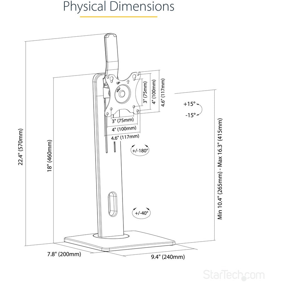 Free-standing Monitor Stand with Rotating Base | Full Motion Articulation | Spring-assisted One-touch Height AdjustmentsThis single monitor stand enables you to raise your monitor off your desk or table to save space while increasing your productivity. With its durable aluminum construction and a sturdy base (7.8"x9.4" / 200mm x 240mm), it can support VESA compatible displays up to 32" and up to 15.4lb / 7kg in weight. The power coated black semi-gloss finish on the support column provides a professional and modern look that will match your monitor and workstation. Please refer to our technical specifications section for more information on the different aspect ratios supported.Adjust your monitor to the ideal positionThe free-standing monitor stand features a wide range of motion so you can position your monitor to the ideal viewing angle, allowing you to work more comfortably and reduce eye and neck strain. You can easily tilt +/-15°; swivel +/-180°; and make height adjustments to fully adjust your monitor so it can meet your ergonomic needs. With a rotating base, this monitor stand lets you swivel your display a total range of +/- 40°.Easy one-touch height adjustmentsThe spring-assisted monitor stand offers a total adjustment range of 10.4" to 16.3" (265mm to 415mm) from the surface or your desk. Height adjustments are easy to make with the built-in easy-access lever at the top of the stand.Keep a tidy setup and protect your deskThis monitor stand lets you keep an organized desk/workstation with the built-in cable management slot at the lower portion of the column. It is equipped with rubber anti-slip pads that will keep your desk or table surface protected from scratches or scuffs.FPPNEUSTND is backed by a StarTech.com 5-year warranty and free lifetime technical support.The StarTech.com Advantage