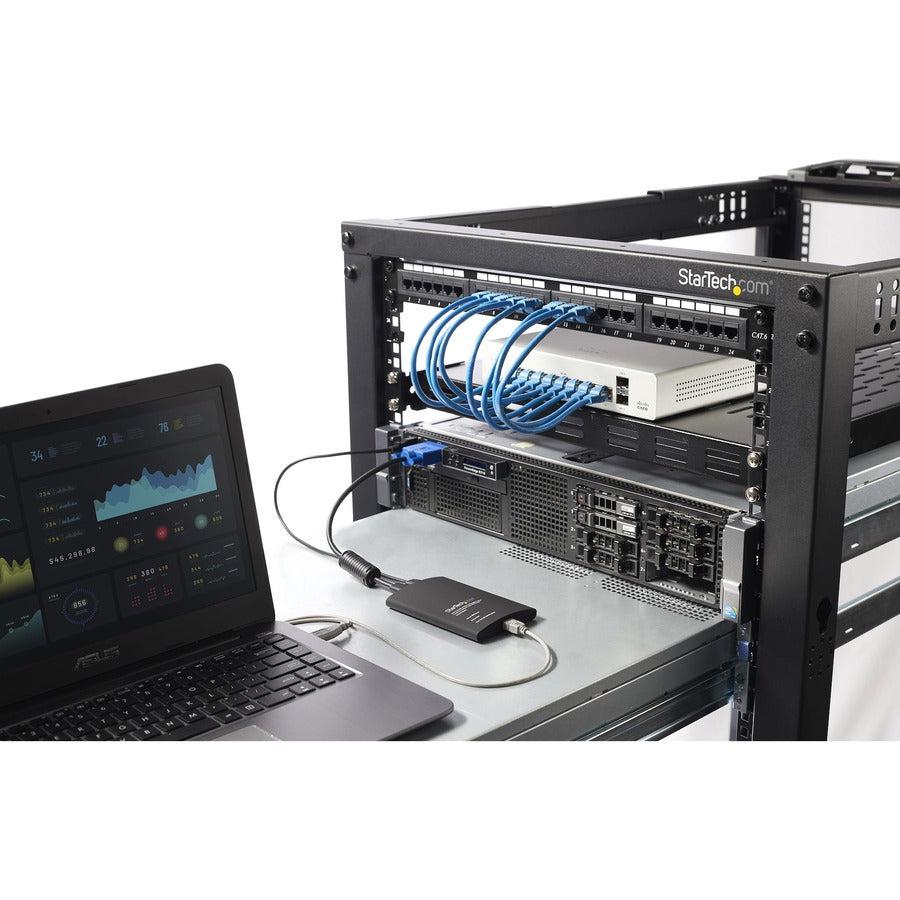 With portability for the mobile administrator or repair technician in mind, this USB-powered adapter features a small-footprint design that requires no additional accessories to connect to most servers, and requires no server-side software installation. Plus, the pocket-sized adapter draws its power from the server-side USB connections, allowing the laptop/netbook to last longer without consuming battery power.