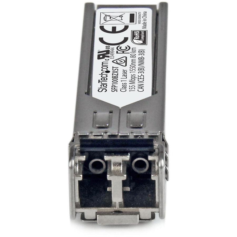 StarTech.com MSA Uncoded SFP Module - 100BASE-ZX - 100MbE Single Mode Fiber (SMF) Optic Transceiver - 100Mb Ethernet SFP - LC 80km - 1550nm - DDM. SFP transceiver type: Fiber optic, Maximum data transfer rate: 155 Mbit/s, Interface type: SFP. Product colour: Silver, Housing material: Aluminium, Certification: CE, FCC, UR. Power consumption (typical): 1 W. Width: 14 mm, Depth: 60 mm, Height: 16 mm. Number of products included: 1 pc(s), Package width: 95 mm, Package depth: 118 mm