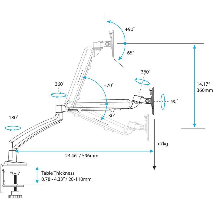 The full motion mount lets you extend the arm a full 23.46" (596 mm). Position your monitor for ideal viewing with the articulating monitor arm. You can tilt and swivel your display with a full range of motion across multiple axes. The spring-assisted height adjustment lets you raise or lower your monitor with smooth and effortless positioning. For viewing longer pages or blocks of code without having to scroll down your screen, the adjustable monitor arm also supports landscape-to-portrait display rotation.