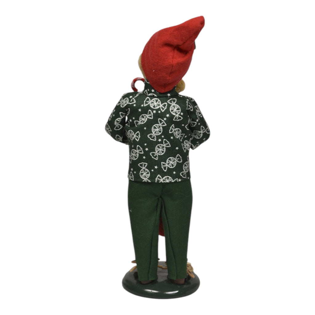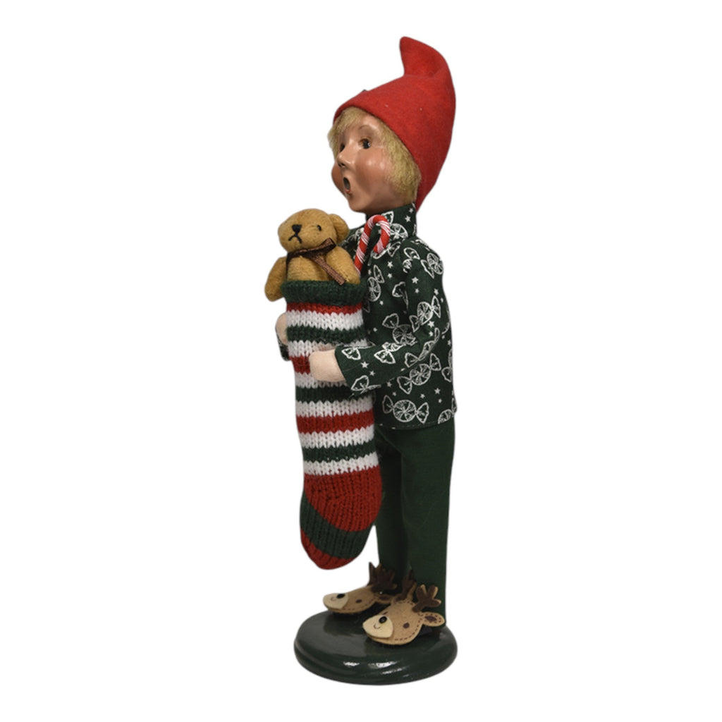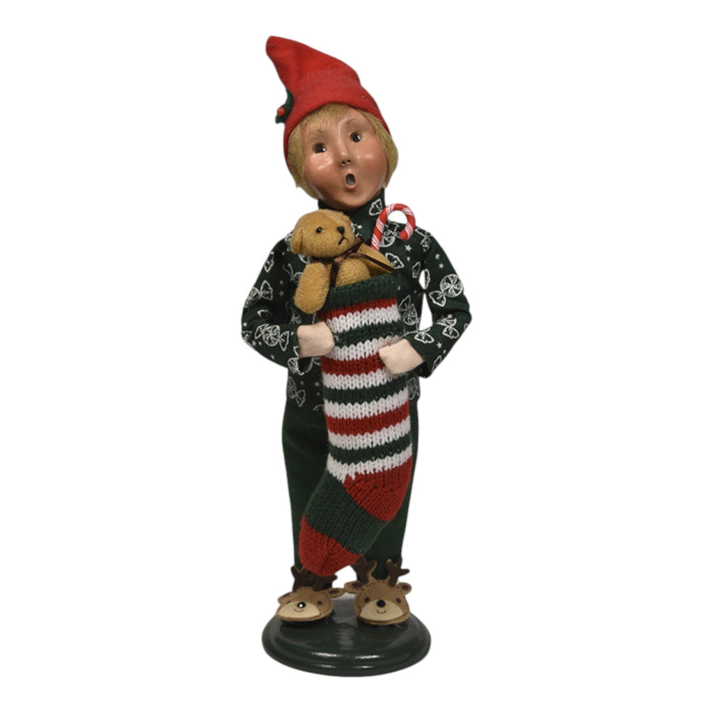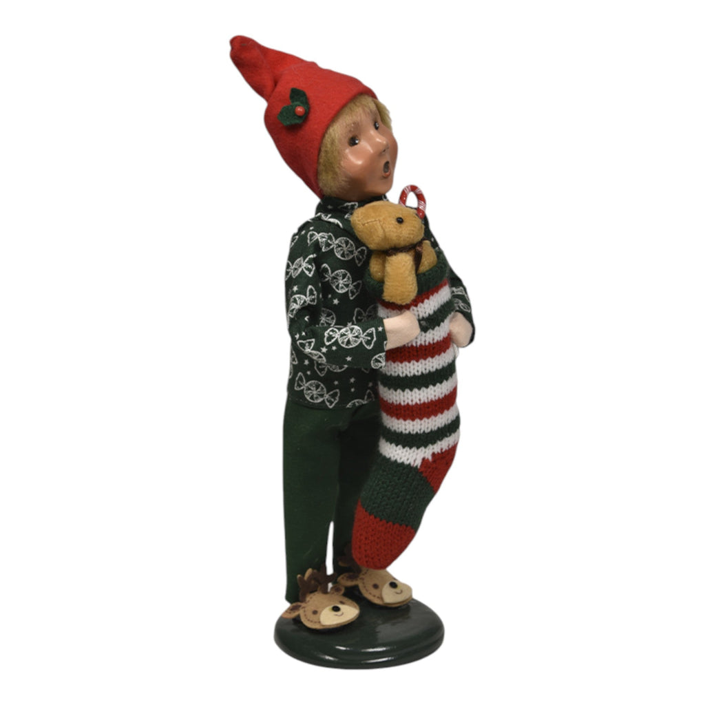 Introduce the spirit of holiday anticipation into your home with the delightful Stocking Family - Boy! Standing at 10 inches tall, this endearing Byers' Choice collectible figurine captures the sheer joy and excitement of Christmas morning. Dressed in festive pajamas adorned with candy canes and sporting an adorable red elf hat, this charming figure holds a cozy stocking filled with treasures, including a cheerful teddy bear and a candy cane. His bright expression radiates the warmth of childhood wonder as he delights in the magic of the season.