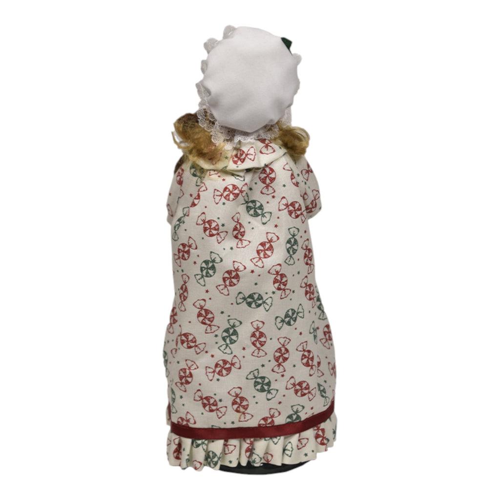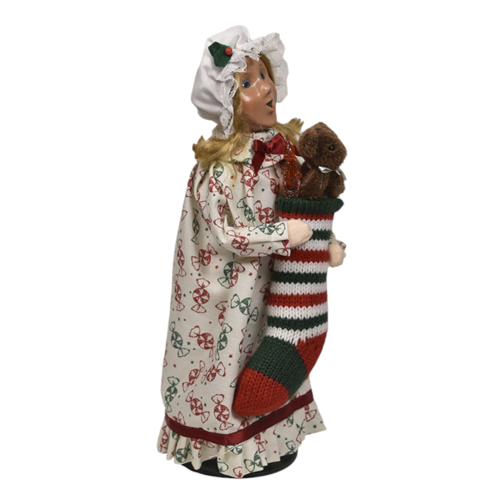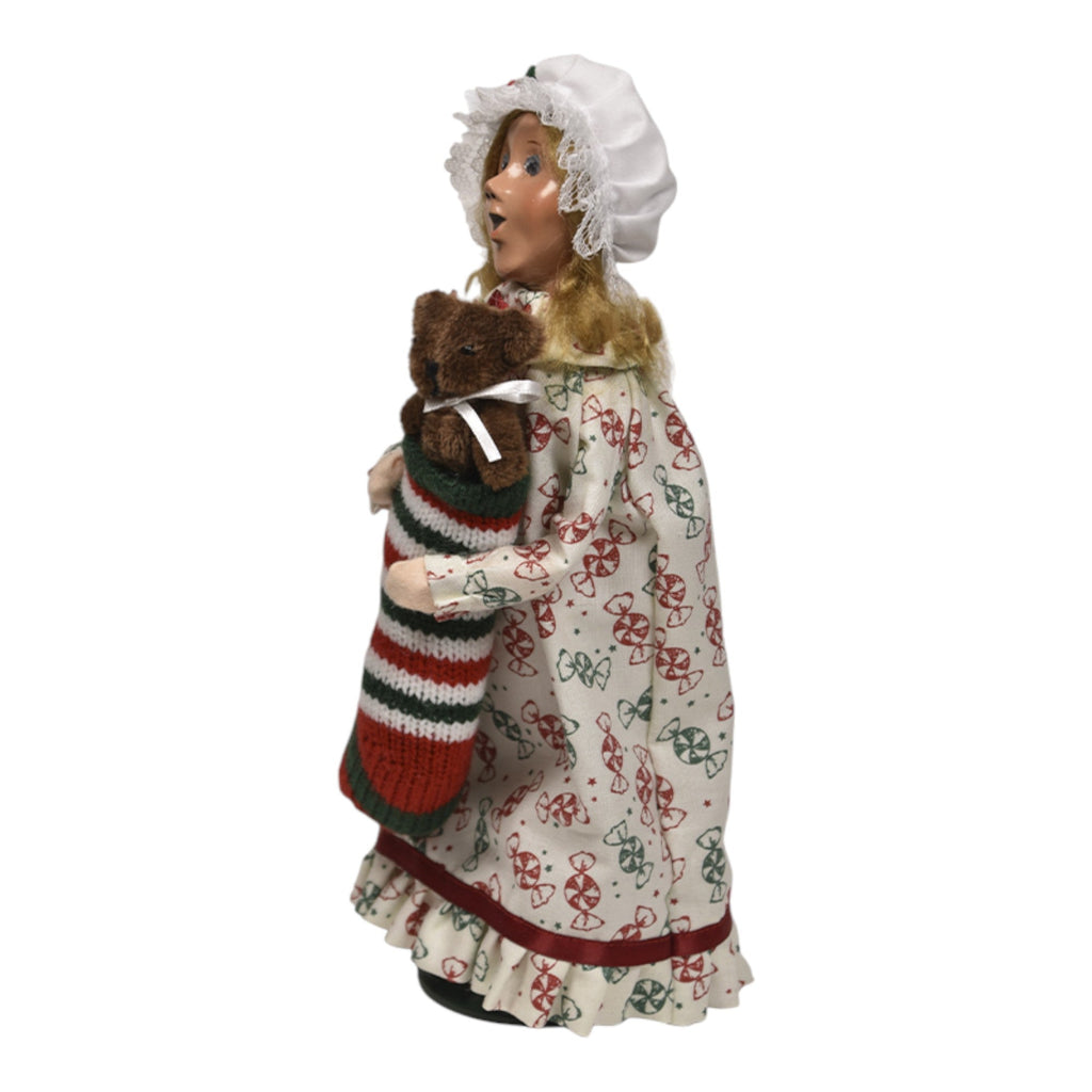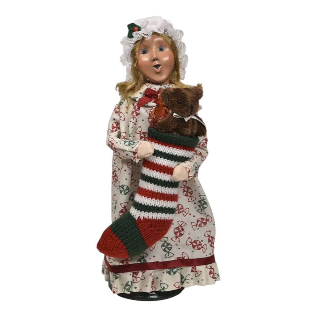 Capture the magic of childhood and holiday traditions with the adorable Stocking Family - Girl figurine! Standing at 10 inches tall, this delightful Byers' Choice collectible is an embodiment of festive joy and innocence. Dressed in a charming candy-cane patterned dress and a lovely bonnet, she holds a vibrant, striped stocking filled with sweet surprises and a cuddly stuffed bear. Her bright smile and playful demeanor radiate the spirit of Christmas, reminding us of the simple joys and wonder of the holiday season.