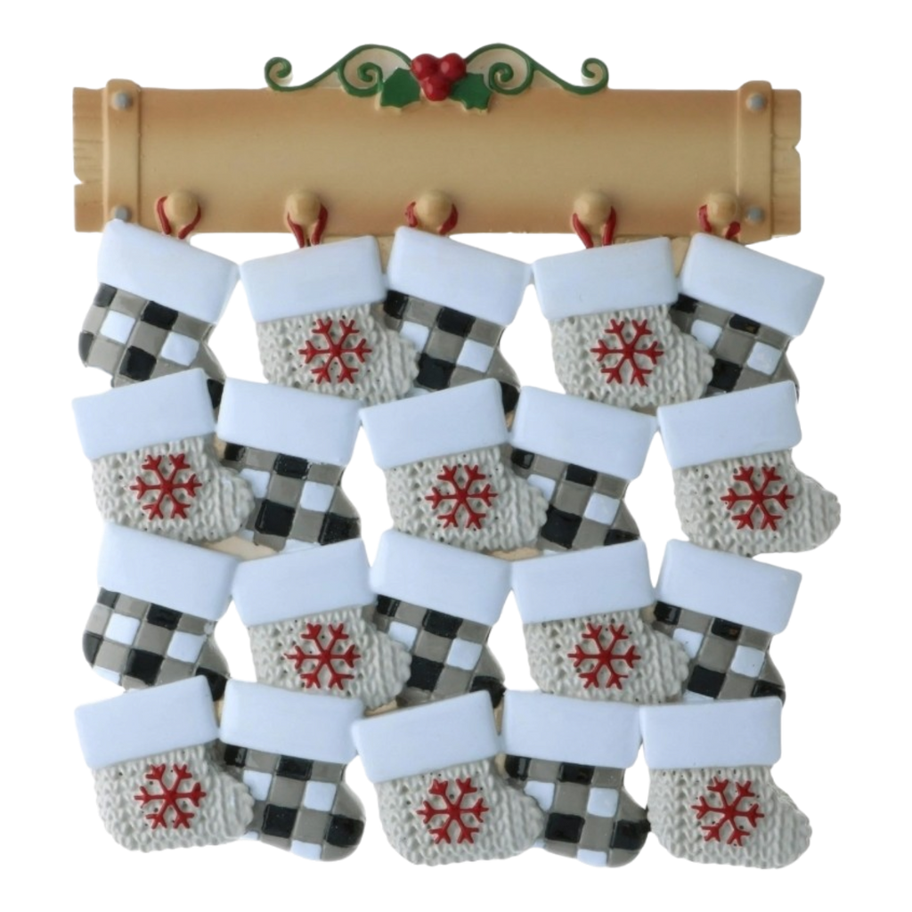 Celebrate the joy of a large family this holiday season with the delightful Stocking Family Up To 20 Ornament! This charming ornament features a beautifully designed display of adorable knit stockings, each with a classic checkered pattern and festive snowflake accents, ready to be filled with holiday goodies. With up to 20 stockings hanging from a decorative wooden bar adorned with cheerful holly, this ornament captures the essence of family gatherings and holiday traditions. Crafted from durable resin, it measures approximately 4.5 inches tall by 4 inches wide, making it a delightful addition to your holiday décor.