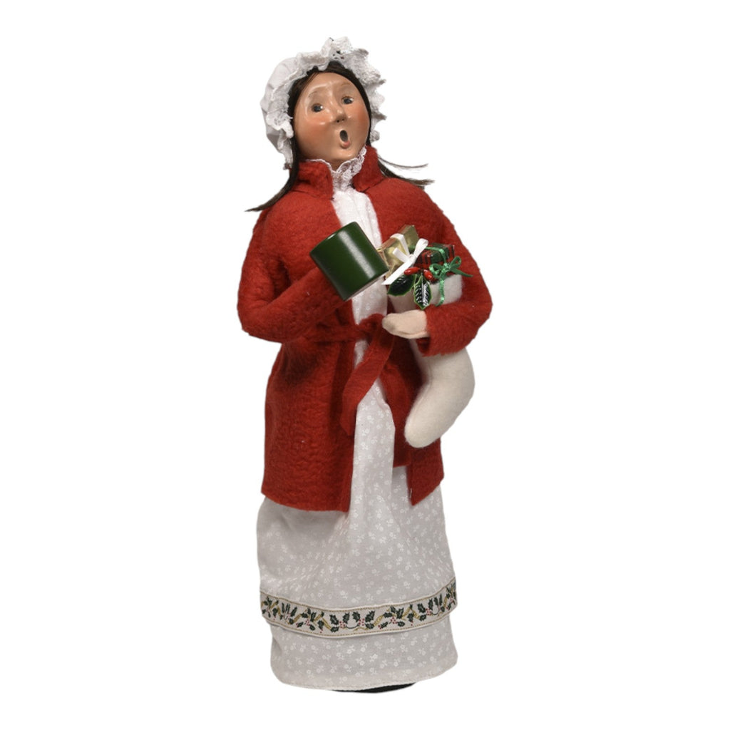 Celebrate the spirit of giving and warmth this holiday season with the enchanting Stocking Family - Woman figurine! Standing gracefully at 13 inches tall, this delightful Byers’ Choice collectible embodies the heart of Christmas traditions. Dressed in a classic white gown adorned with festive patterns, she wears a cozy red shawl and a charming cap, holding a beautiful stocking ready to be filled with goodies. Her joyful expression radiates the excitement and love that come with the festive season, inviting all to come together and share in the merriment.