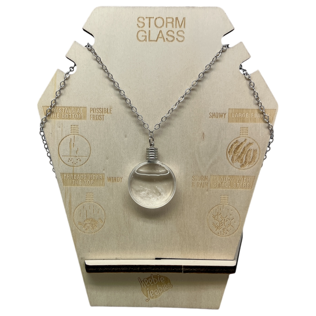 Browse the Complete Gifts & Holiday Collection Discover the beauty and practicality of the Necklace Storm Glass, a charming accessory that combines style with function. Suspended from a sleek silver-plated chain, this pendant features a 1.5-inch storm glass that serves as a historical weather-predicting device, originally popularized by Admiral Robert Fitzroy after his famous voyage on the HMS Beagle.