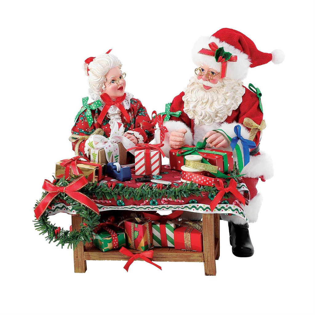 Bows adorn Santa as he and Mrs. Claus wrap gifts at their wrapping station.