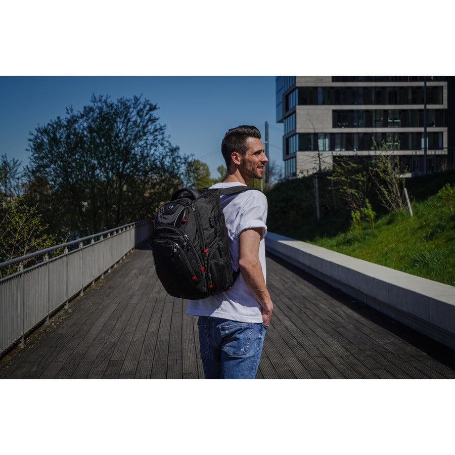 Circuit backpack is a simple black backpack with small red accents. It is perfect for students, professionals and travelers.