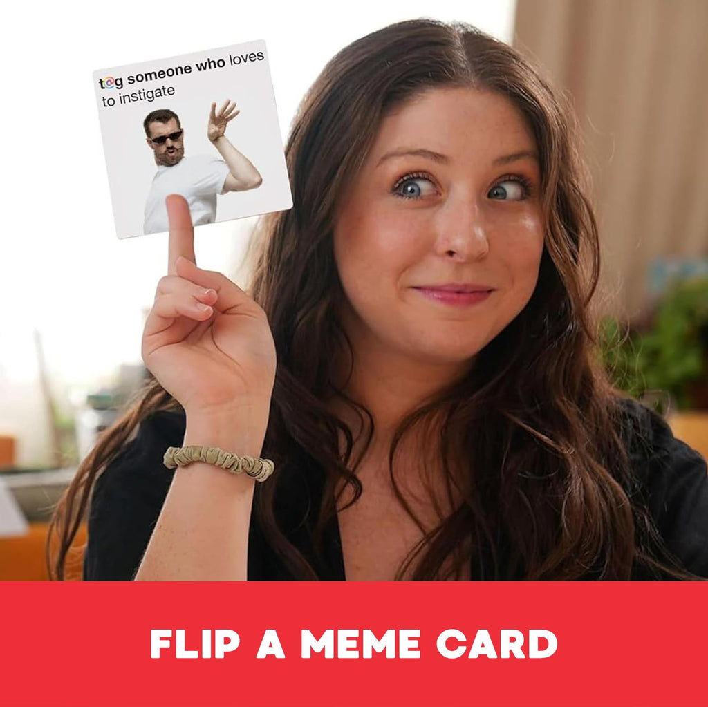 - HOW TO PLAY: Flip a meme card. Everyone votes for who best fits the meme card. On the count of 3, everyone flips their answer. The player tagged the most keeps the meme card. Play until someone gets 5 meme cards- you win!