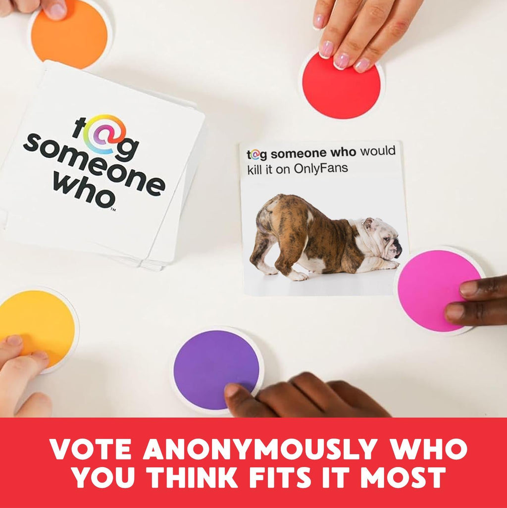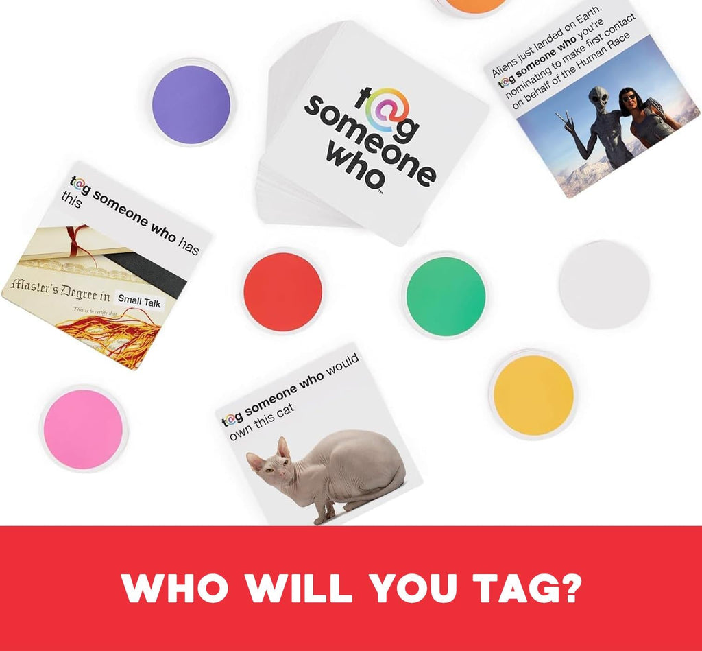 - T@G SOMEONE WHO: Ever get tagged in a funny or cringy post because it's so you' Now's the time to take it offline by tagging each other IRL! For 3-8 players, ages 18 and up.
