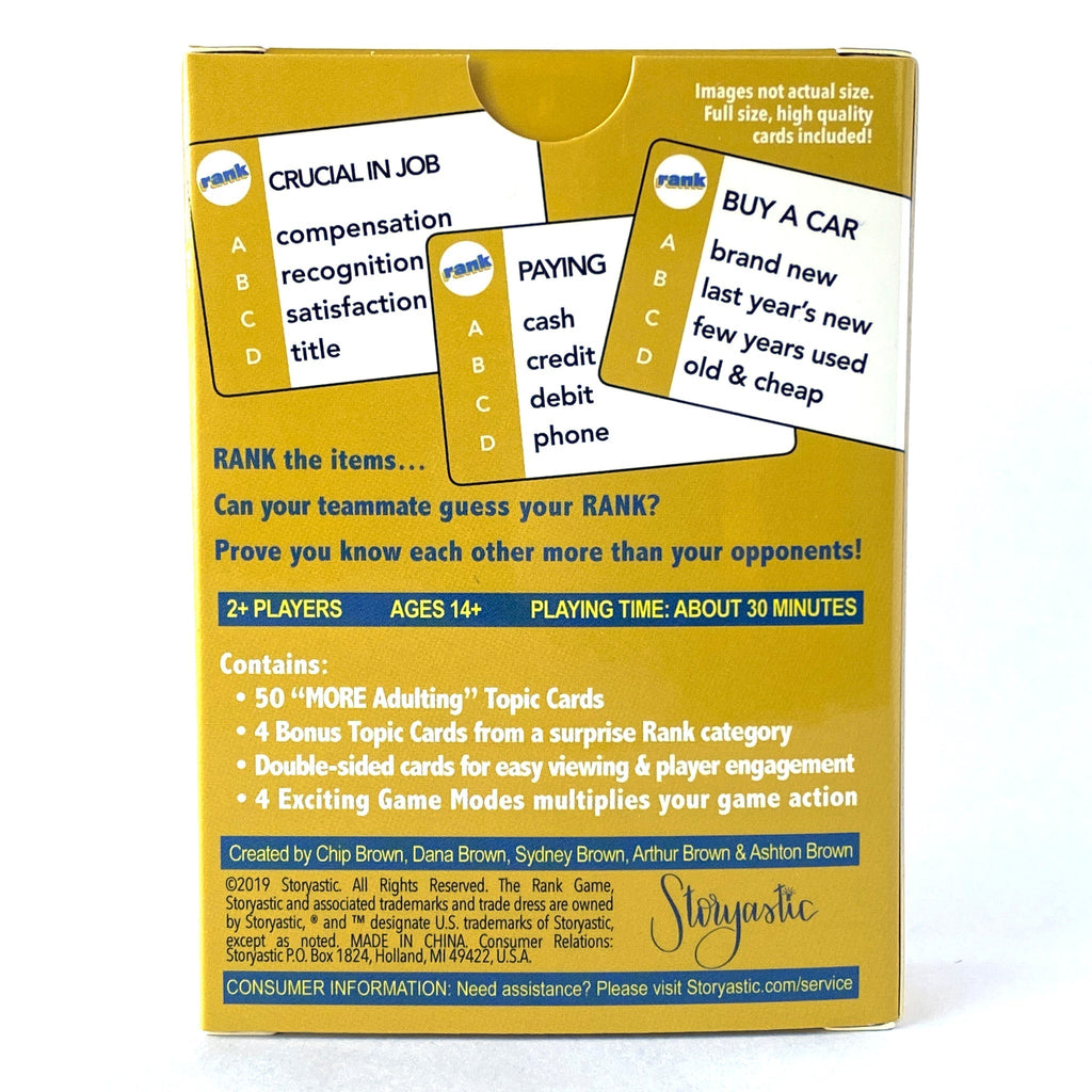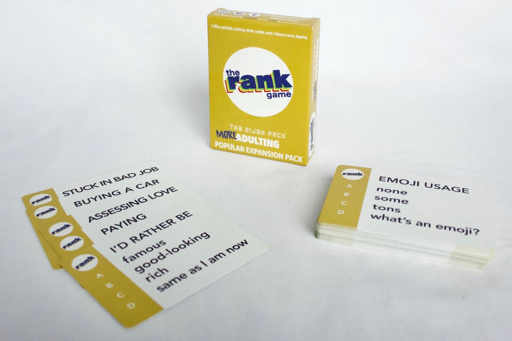 Double your "Adulting" topic cards in The Rank Game with the "MORE Adulting" category deck of 50 topic cards about cooking, cocktails, coffee, work, washing, wallets, take out, tacos and tipping.