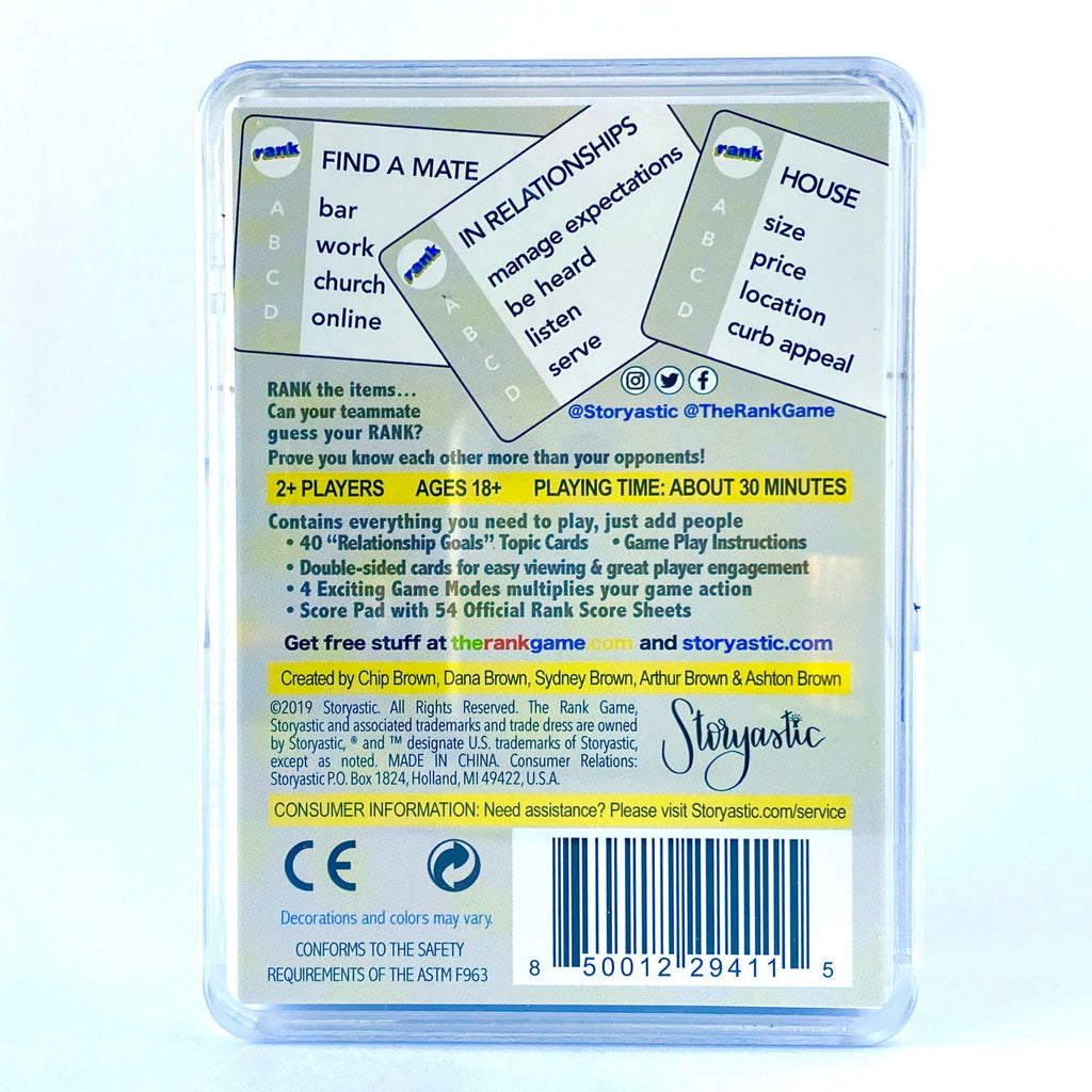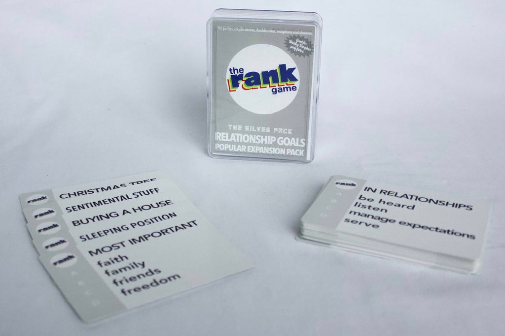 Get The Rank Game's "Relationship Goals" category deck of 40 topic cards for parties, couple convos, double dates, receptions and showers.