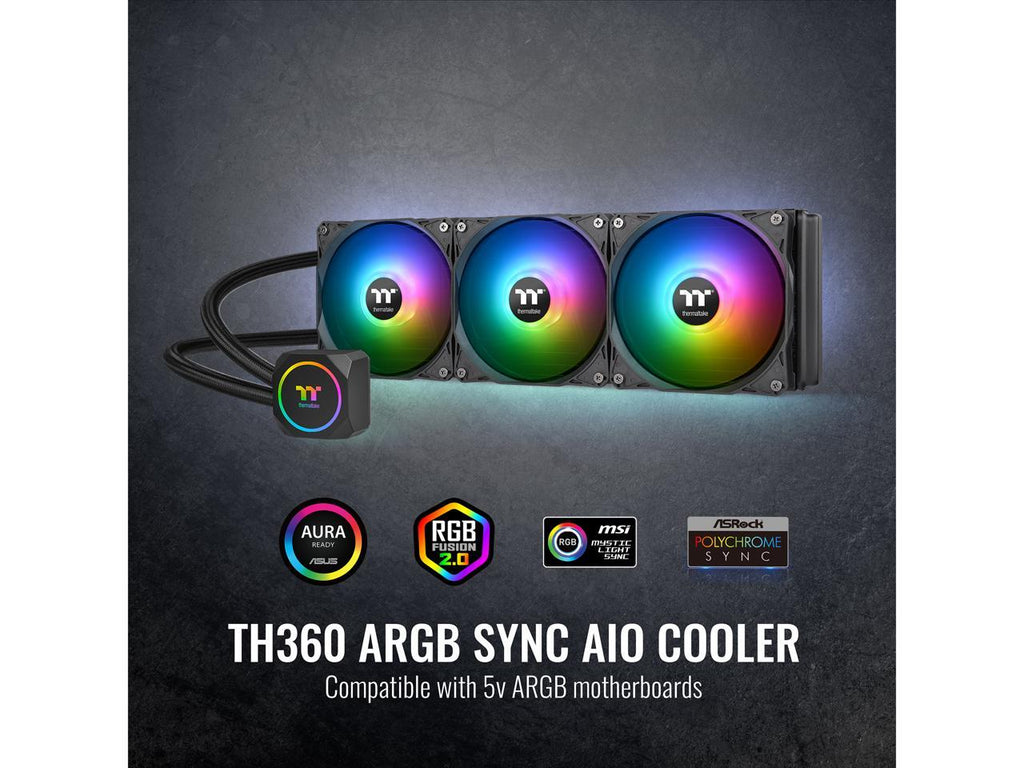 Thermaltake TH360 ARGB Sync is an all-in-one liquid cooler which includes three 120mm powerful high static pressure fans, and a high performance radiator along with a water block, 16.8M RGB color illumination with pre-set lighting modes via the smart fan controller, or synchronize with motherboard RGB software for stunning RGB colors.
