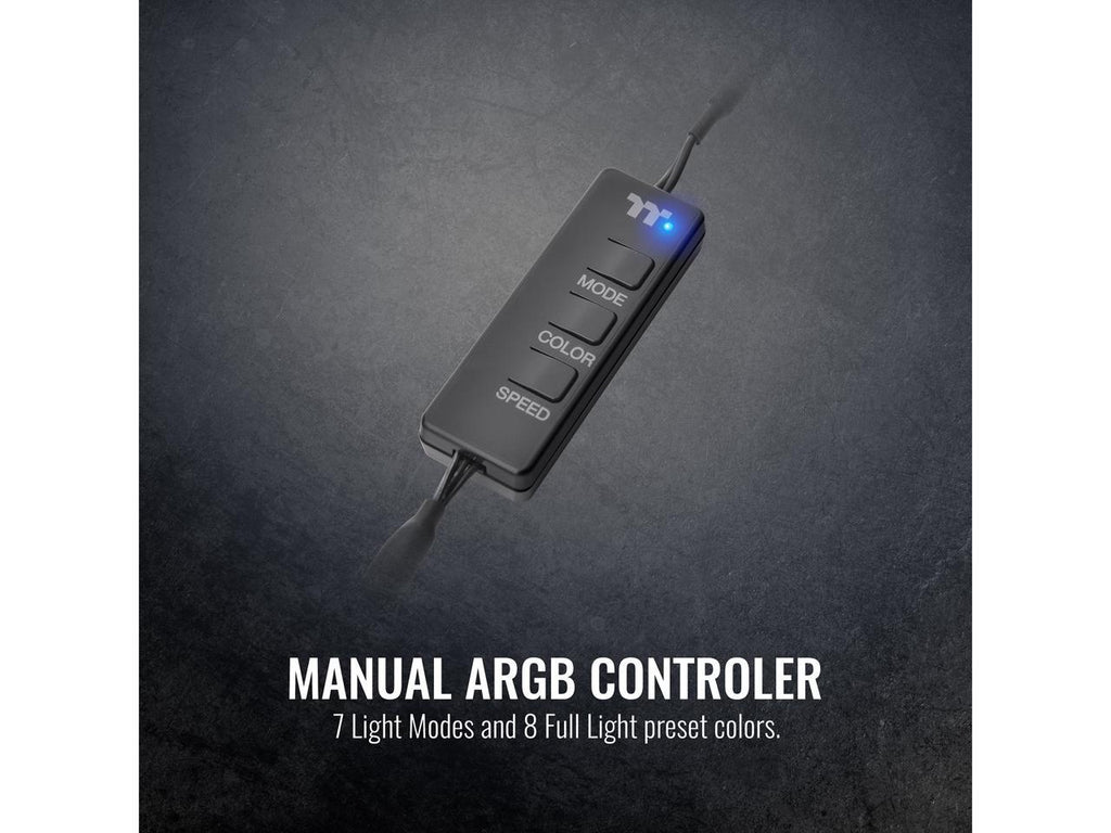 The ARGB controller allows users to switch LED modes, LED colors, and lighting speeds when using a motherboard without a 5V addressable RGB header. Users can switch between flow, ripple, pulse, blink, wave, full light, RGB spectrum, and off modes with various colors and LED speed options.