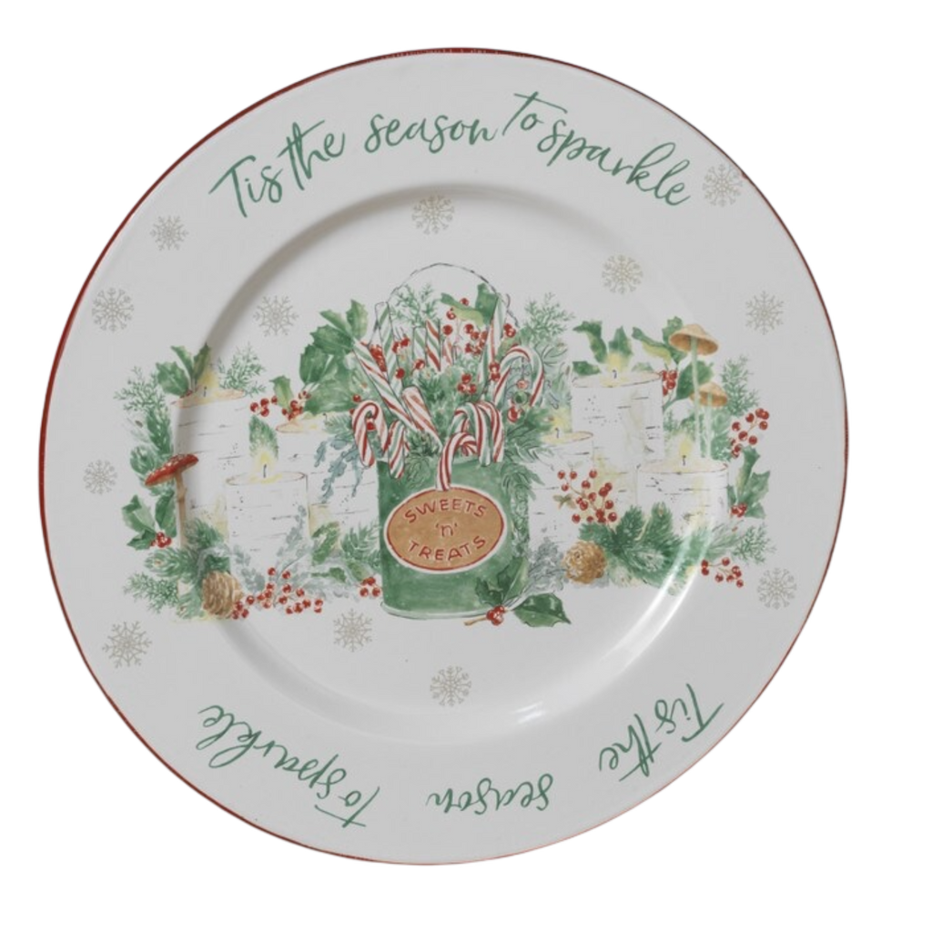 Celebrate the joy of the holiday season with our charming 'Tis the Season to Sparkle Holiday Plate! Measuring 13.25 inches in diameter, this beautifully designed metal enamel plate features a festive holiday motif that embodies the spirit of Christmas. Adorned with delightful illustrations of candy canes, snowflakes, and seasonal greenery, the enchanting design invites warmth and cheer to your celebrations.