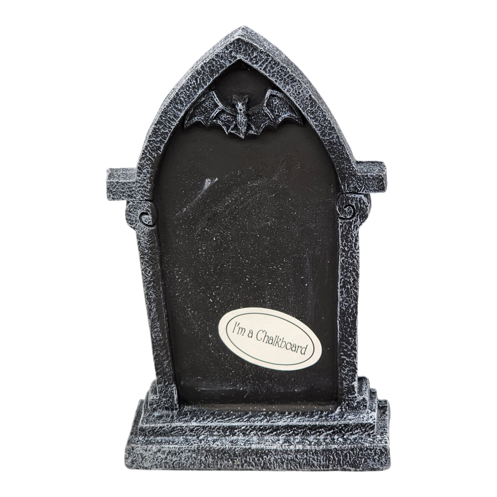 Elevate your Halloween decor with this spine-tingling chalkboard tombstone! Standing at 8 inches tall and 5 inches wide this creatively designed piece features a spooky skull atop an ornate engraved frame perfect for setting a creepy yet fun vibe at your festivities. The textured resin surface gives it an authentic graveyard feel making it a standout addition to your haunted house setup or outdoor display.